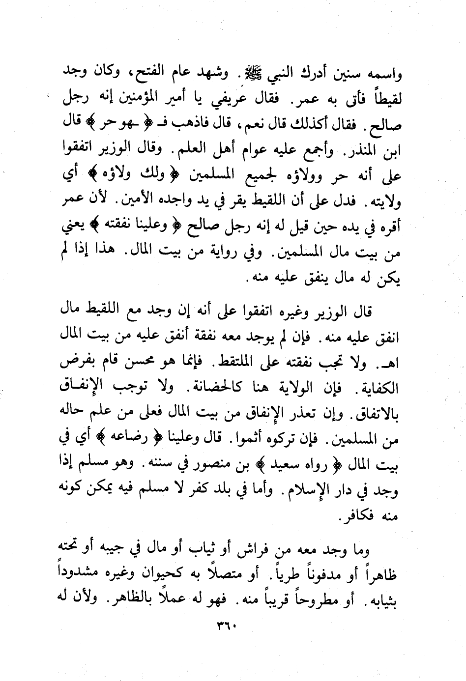 واسمه سنين أدرك النبي - صلى الله عليه وسلم - وشهد عام الفتح، وكان وجد لقيطًا فأتى به عمر. فقال عريفي يا أمير المؤمنين إنه رجل صالح. فقال أكذلك قال نعم، قال فاذهب فـ (ـهو حر) قال ابن المنذر. وأجمع عليه عوام أهل العلم. وقال الوزير اتفقوا على أنه حر وولاؤه لجميع المسلمين (ولك ولاؤه) أي ولايته فدل على أن اللقيط يقر في يد واجده الأمين. لأن عمر أقره في يده حين قيل له إنه رجل صالح (وعلينا نفقته) يعني من بيت مال المسلمين. وفي رواية من بيت المال. هذا إذا لم يكن له مال ينفق عليه منه.