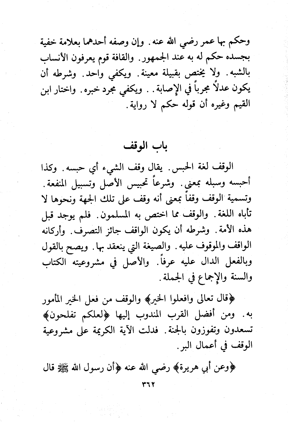 الوقف لغة الحبس. يقال وقف الشيء أي حبسه. وكذا أحبسه وسبله بمعنى. وشرعًا تحبيس الأصل وتسبيل المنفعة. وتسمية الوقف وقفًا بمعنى أنه وقف على تلك الجهة ونحوها تأباه اللغة. والوقف مما اختص به المسلمون فلم يوجد قبل هذه الأمة. وشرطه أن يكون الواقف جائز التصرف. وأركانه الواقف والموقوف عليه. والصيغة التي ينعقد بها. ويصح بالقول وبالفعل الدال عليه عرفًا. والأصل في مشروعيته الكتاب والسنة والإجماع في الجملة.