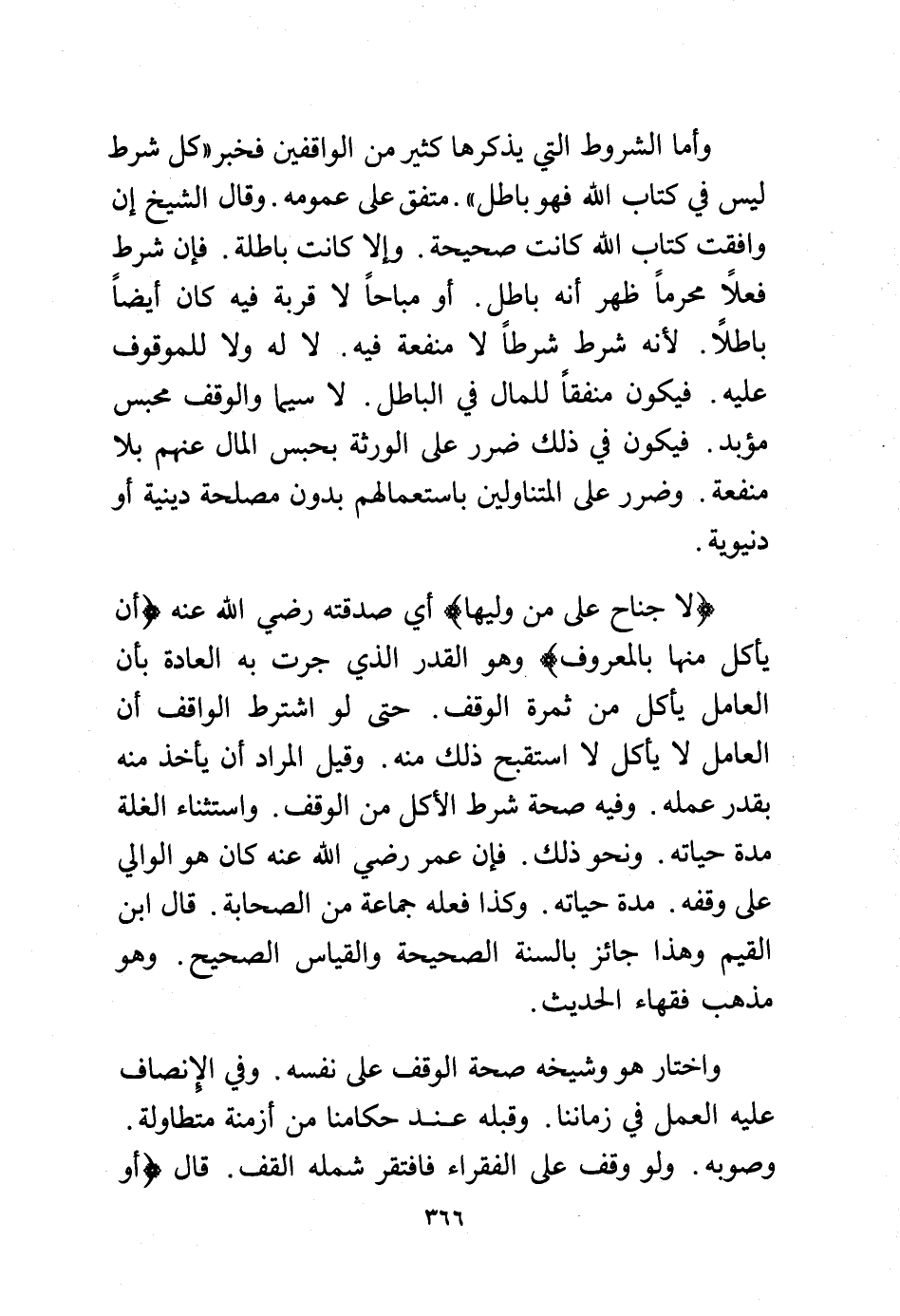 وأما الشروط التي يذكرها كثير من الواقفين فخبر "كل شرط ليس في كتاب الله فهو باطل". متفق على عمومه. وقال الشيخ إن وافقت كتاب الله كانت صحيحة. وإلا كانت باطلة. فإن شرط فعلًا محرمًا ظهر أنه باطل. أو مباحًا لا قربة فيه كان أيضًا باطلًا. لأنه شرط شرطًا لا منفعة فيه لا له ولا للموقوف عليه. فيكون منفقًا للمال في الباطل. لا سيما والوقف محبس مؤبد. فيكون في ذلك ضرر على الورثة بحبس المال عنهم بلا منفعة. وضرر على المتناولين باستعمالهم بدون مصلحة دينية أو دنيوية.