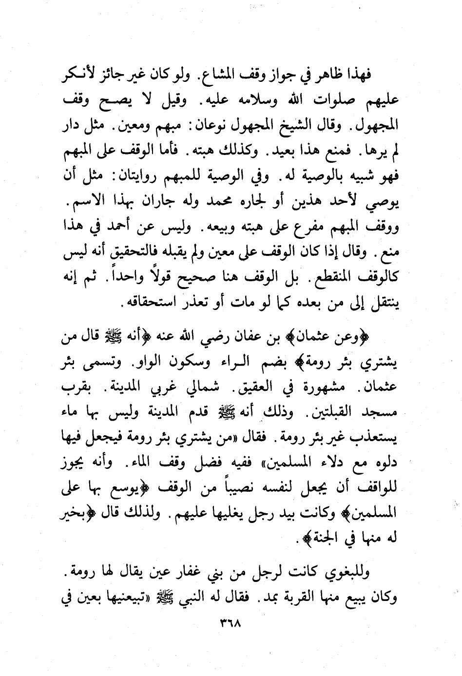 (وعن عثمان) بن عفان -رضي الله عنه- (أنه - صلى الله عليه وسلم - قال من يشتري بئر رومة) بضم الراء وسكون الواو. وتسمى بئر عثمان. مشهورة في العقيق. شمالي غربي المدينة. بقرب مسجد القبلتين. وذلك أنه - صلى الله عليه وسلم - قدم المدينة وليس بها ماء يستعذب غير بئر رومة. فقال "من يشتري بئر رومة فيجعل فيها دلوه مع دلاء المسلمين" ففيه فضل وقف الماء. وأنه يجوز للواقف أن يجعل لنفسه نصيبًا من الوقف (يوسع بها على المسلمين) وكانت بيد رجل يغليها عليهم. ولذلك قال (بخير له منها في الجنة).