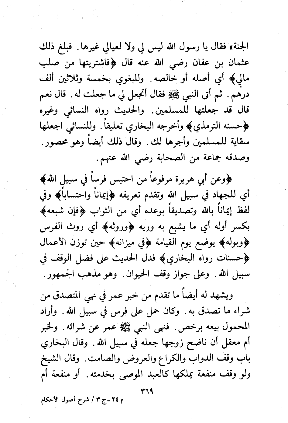 (وعن أبي هريرة مرفوعًا من احتبس فرسًا في سبيل الله) أي للجهاد في سبيل الله وتقدم تعريفه (إيمانًا واحتسابًا) وفي لفظ إيمانًا بالله وتصديقًا بوعده أي من الثواب (فإن شبعه) بكسر أوله أي ما يشبع به وريه (وروثه) أي روث الفرس (وبوله) يوضع يوم القيامة (في ميزانه) حين توزن الأعمال (حسنات رواه البخاري) فدل الحديث على فضل الوقف في سبيل الله. وعلى جواز وقف الحيوان. وهو مذهب الجمهور.