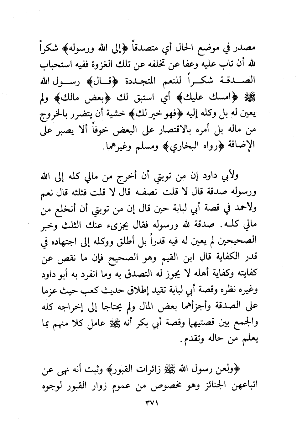 ولأبي داود إن من توبتي أن أخرج من مالي كله إلى الله ورسوله صدقة قال لا قلت نصفه قال لا قلت فثلثه قال نعم ولأحمد في قصة أبي لبابة حين قال إن من توبتي أن أنخلع من مالي كله. صدقة لله ورسوله فقال يجزئ عنك الثلث وخبر الصحيحين لم يعين له فيه قدرًا بل أطلق ووكله إلى اجتهاده في قدر الكفاية قال بن القيم وهو الصحيح فإن ما تقصي عن كفايته وكفاية أهله لا يجوز له التصدق به وما انفرد به أبو داود وغيره نظره وقصة أبي لبابة تقيد إطلاق حديث كعب حيث عزما على الصدقة وأجزأهما بعض المال ولم يحتاجا إلى إخراجه كله والجمع بين قصتيهما وقصة أبي بكر أنه - صلى الله عليه وسلم - عامل كلا منهم بما يعلم من حاله وتقدم.