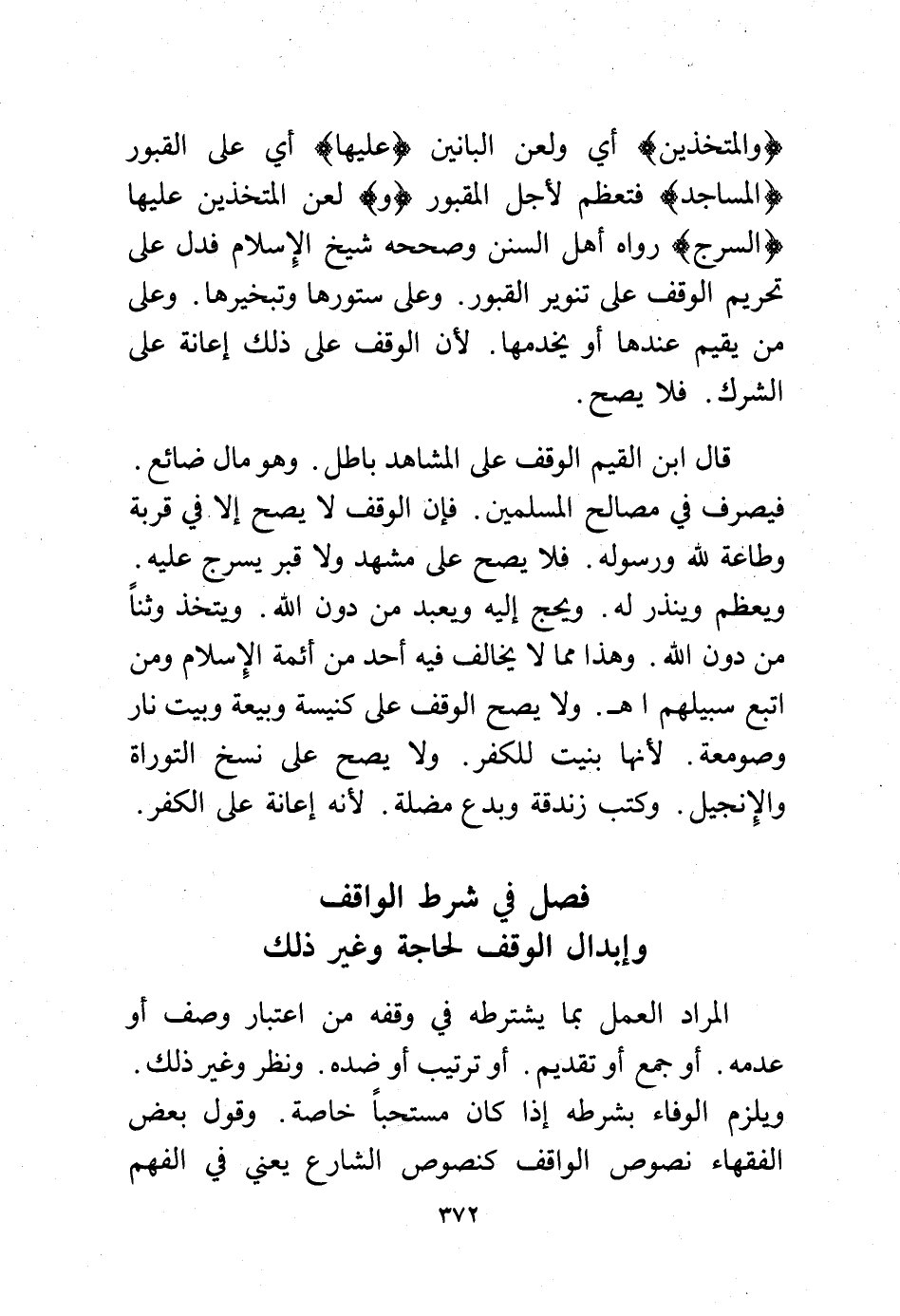 قال ابن القيم الوقف على المشاهد باطل. وهو مال ضائع. فيصرف في مصالح المسلمين. فإن الوقف لا يصح إلا في قربة وطاعة لله ورسوله. فلا يصح على مشهد ولا قبر يسرج عليه ويعظم وينذر له. ويحج إليه ويعبد من دون الله. ويتخذ وثنًا من دون الله. وهذا مما لا يخالف فيه أحد من أئمة الإسلام ومن اتبع سبيلهم اهـ. ولا يصح الوقف على كنيسة وبيعة وبيت نار وصومعة. لأنها بنيت للكفر. ولا يصح على نسخ التوراة والإنجيل. وكتب زندقة وبدع مضلة. لأنه إعانة على الكفر.