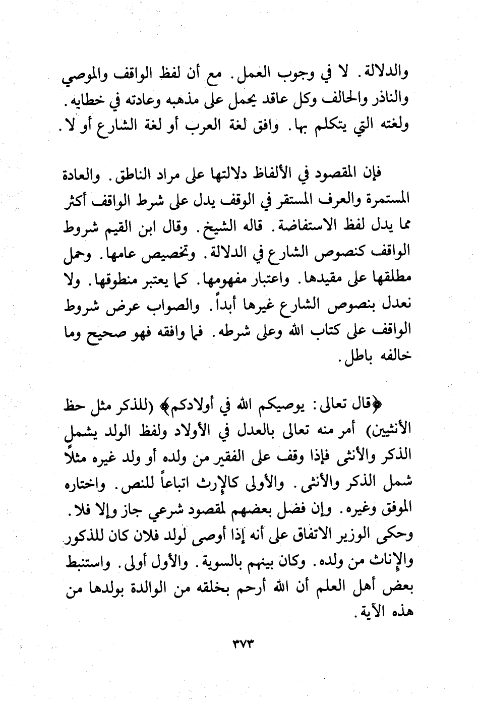 (قال تعالى: {يُوصِيكُمُ اللهُ فِي أَوْلاَدِكُمْ} {لِلذَّكَرِ مِثْلُ حَظِّ الأُنثَيَيْنِ} أمر منه تعالى بالعدل في الأولاد ولفظ الولد يشمل الذكر والأنثى فإذا وقف على الفقير من ولده أو ولد غيره مثل شمل الذكر والأنثى. والأولى كالإرث اتباعًا للنص. واختاره الموفق وغيره. وإن فضل بعضهم لمقصود شرعي جاز وإلا فلا. وحكى الوزير الاتفاق على أنه إذا أوصى لولد فلان كان للذكور والإناث من ولده. وكان بينهم بالسوية. والأول أولى. واستنبط بعض أهل العلم أن الله أرحم بخلقه من الوالدة بولدها من هذه الآية.