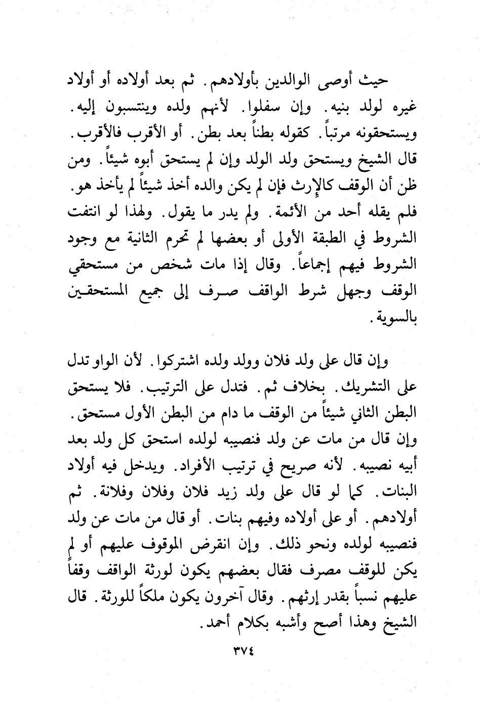 حيث أوصى الوالدين بأولادهم. ثم بعد أولاده أو أولاد غيره لولد بنيه. وإن سفلوا لأنهم ولده وينتسبون إليه. ويستحقونه مرتبًا كقوله بطنًا بعد بطن. أو الأقرب فالأقرب. قال الشيخ ويستحق ولد الولد وإن لم يستحق أبوه شيئًا. ومن ظن أن الوقف كالإرث فإن لم يكن والده أخذ شيئًا لم يأخذ هو. فلم يقله أحد من الأئمة. ولم يدر ما يقول. ولهذا لو انتفت الشروط في الطبقة الأولى أو بعضها لم تحرم الثانية مع وجود الشروط فيهم إجماعًا. وقال إذا مات شخص من مستحقي الوقف وجهل شرط الواقف صرف إلى جميع المستحقين بالسوية.