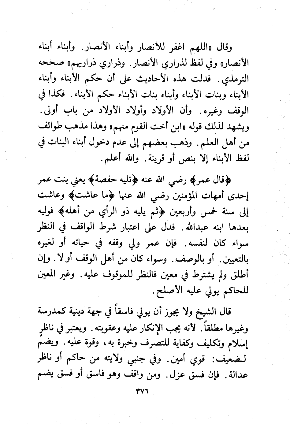 وقال "اللهم اغفر للأنصار وأبناء الأنصار. وأبناء أبناء الأنصار" وفي لفظ لذراري الأنصار. وذراري ذراريهم" صححه الترمذي. فدلت هذه الأحاديث على أن حكم الأبناء وأبناء الأبناء وبنات الأبناء وأبناء بنات الأبناء حكم الأبناء. فكذا في الوقف وغيره وأن الأولاد وأولاد الأولاد من باب أولى. ويشهد لذلك قوله "ابن أخت القوم منهم" وهذا مذهب طوائف من أهل العلم. وذهب بعضهم إلى عدم دخول أبناء البنات في لفظ الأبناء إلا بنص أو قرينة والله أعلم.