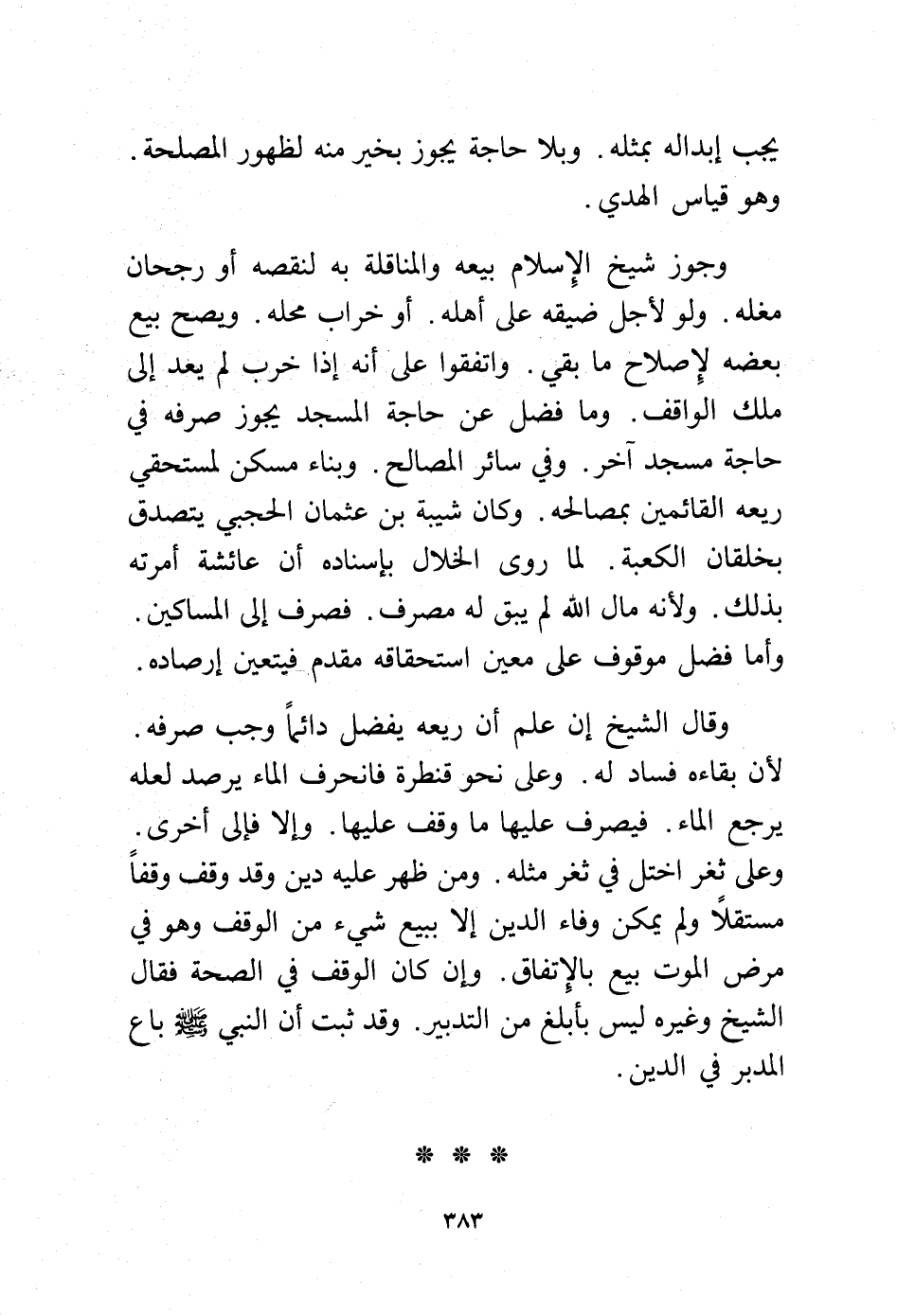 وجوز شيخ الإسلام بيعه والمناقلة به لنقصه أو رجحان مغله. ولو لأجل ضيقه على أهله. أو خراب محله. ويصح بيع بعضه لإصلاح ما بقي. واتفقوا على أنه إذا خرب لم يعد إلى ملك الواقف. وما فضل عن حاجة المسجد يجوز صرفه في حاجة مسجد آخر. وفي سائر المصالح. وبناء مسكن لمستحقي ريعه القائمين بمصالحه. وكان شيبة بن عثمان الحجبي يتصدق بخلقان الكعبة. لما روى الخلال بإسناده أن عائشة أمرته بذلك. ولأنه مال الله لم يبق له مصرف فصرف إلى المساكين. وأما فضل موقوف على معين استحقاقه مقدم فيتعين إرصاده.