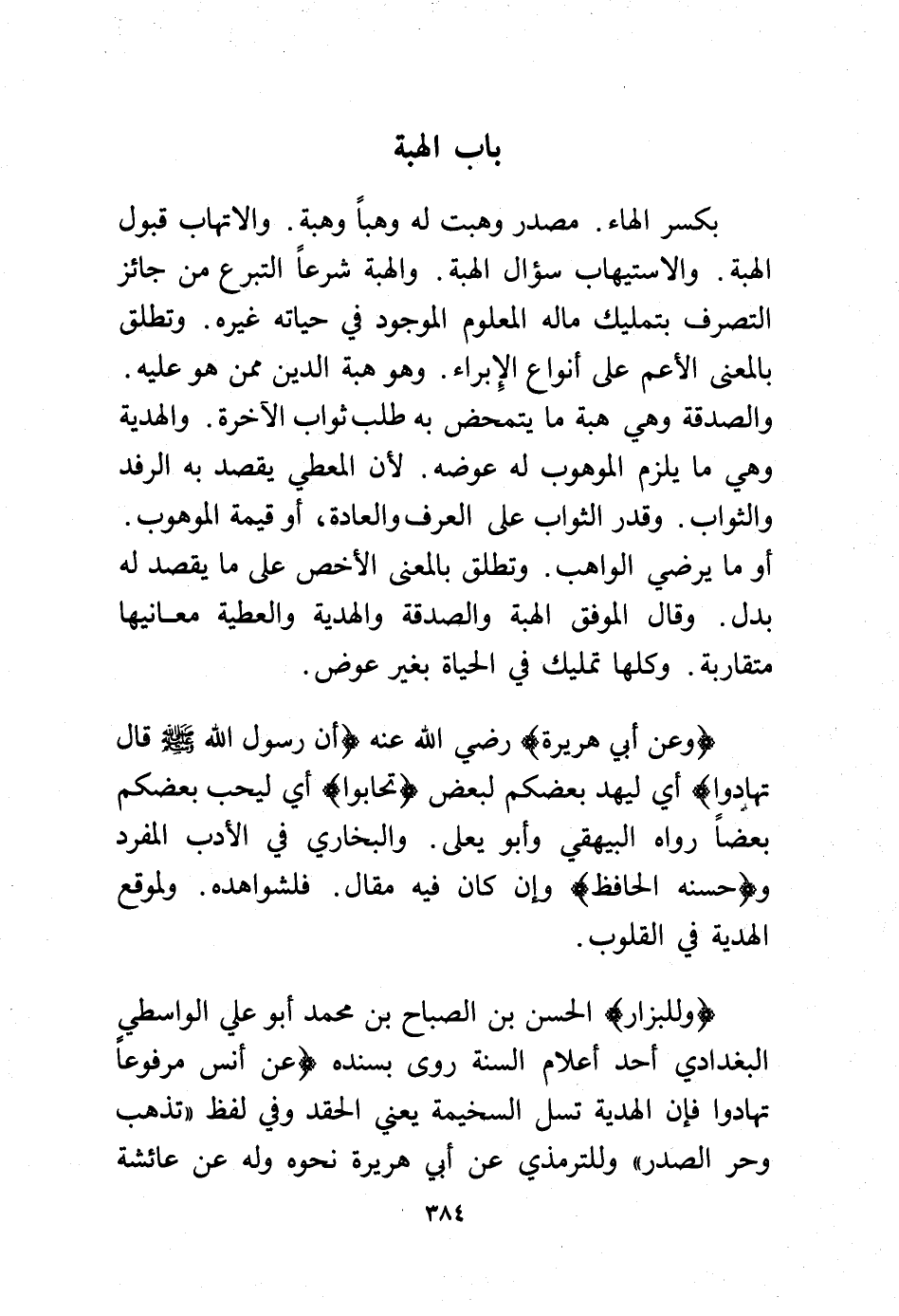 بكسر الهاء. مصدر وهبت له وهبًا وهبة. والاتهاب قبول الهبة والاستيهاب سؤال الهبة. والهبة شرعًا التبرع من جائز التصرف بتمليك ماله المعلوم الموجود في حياته غيره. وتطلق بالمعنى الأعم على أنواع الإبراء. وهو هبة الدين ممن هو عليه. والصدقة وهي هبة ما يتمحض به طلب ثواب الآخرة. والهدية وهي ما يلزم الموهوب له عوضه. لأنه المعطي يقصد به الرفد والثواب. وقدر الثواب على العرف والعادة، أو قيمة الموهوب. أو ما يرضي الواهب. وتطلق بالمعنى الأخص على ما يقصد له بدل وقال الموفق الهبة والصدقة والهدية والعطية معانيها متقاربة. وكلها تمليك في الحياة بغير عوض.