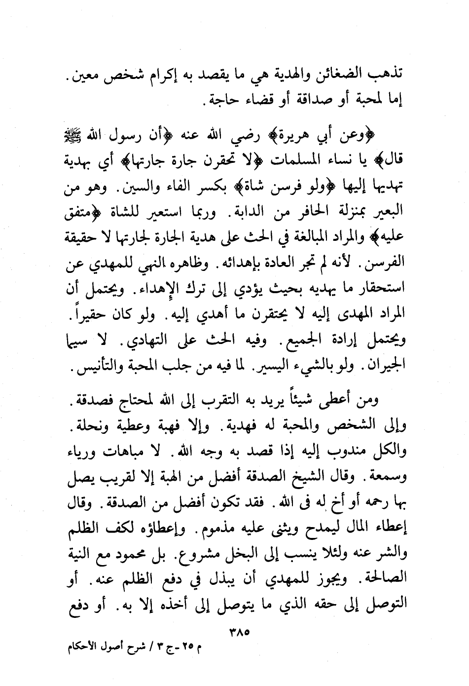(وعن أبي هريرة) -رضي الله عنه- (أن رسول الله - صلى الله عليه وسلم - قال) يا نساء المسلمات (لا تحقرن جارة لجارتها) أي بهدية تهديها إليها (ولو فرسن شاة) بكسر الفاء والسين. وهو من البعير بمنزلة الحافر من الدابة. وربما استعير للشاة (متفق عليه) والمراد المبالغة في الحث على هدية الجارة لجارتها لا حقيقة الفرسن. لأنه لم تجدر العادة بإهدائه. وظاهره النهي للمهدي عن استحقار ما يهديه بحيث يؤدي إلى ترك الإهداء. ويحتمل أن المراد المهدي إليه لا يحتقرن ما أهدي إليه. ولو كان حقيرًا ويحتمل إرادة الجميع. وفيه الحث على التهادي. لا سيما الجيران. ولو بالشيء اليسير. لما فيه من جلب المحبة والتأنيس.