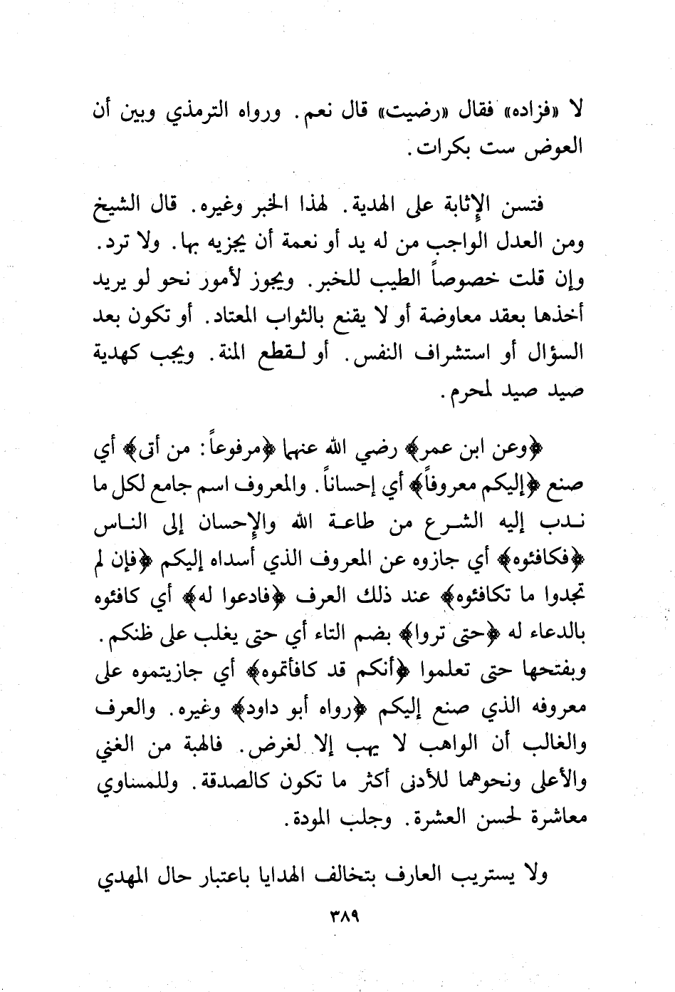 (وعن ابن عمر) -رضي الله عنهما- (مرفوعًا: من أتى) أي صنع (إليكم معروفًا) أي إحسانًا والمعروف اسم جامع لكل ما ندب إليه الشرع من طاعة الله والإحسان إلى الناس (فكافئوه) أي جازوه عن المعروف الذي أسداه إليكم (فإن لم تجدوا ما تكافئوه) عند ذلك العرف (فادعوا له) أي كافئوه بالدعاء له (حتى تروا) بضم التاء أي حتى يغلب على ظنكم. وبفتحها حتى تعلموا (أنكم قد كافأتموه) أي جازيتموه على معروفه الذي صنع إليكم (رواه أبو داود) وغيره والعرف والغالب أن الواهب لا يهب إلا لغرض. فالهبة من الغني والأعلى ونحوهما للأدنى أكثر ما تكون كالصدقة. وللمساوي معاشرة لحسن العشرة. وجلب المودة.