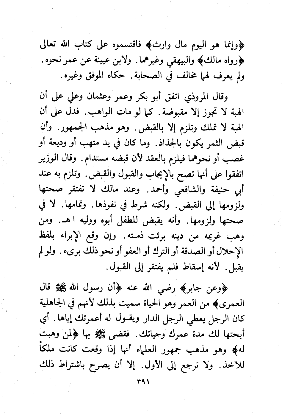 (وعن جابر) -رضي الله عنه- (أن رسول الله - صلى الله عليه وسلم - قال العمرى) من العمر وهو الحياة سميت بذلك لأنهم في الجاهلية كان الرجل يعطي الرجل الدار ويقول له أعمرتك إياها أي أبحتها لك مدة عمرك وحياتك فقضى - صلى الله عليه وسلم - بها (لمن وهبت له) وهو مذهب جمهور العلماء أنها إذا وقعت كانت ملكًا للآخذ ولا ترجع إلى الأول. إلا أن يصرح باشتراط ذلك