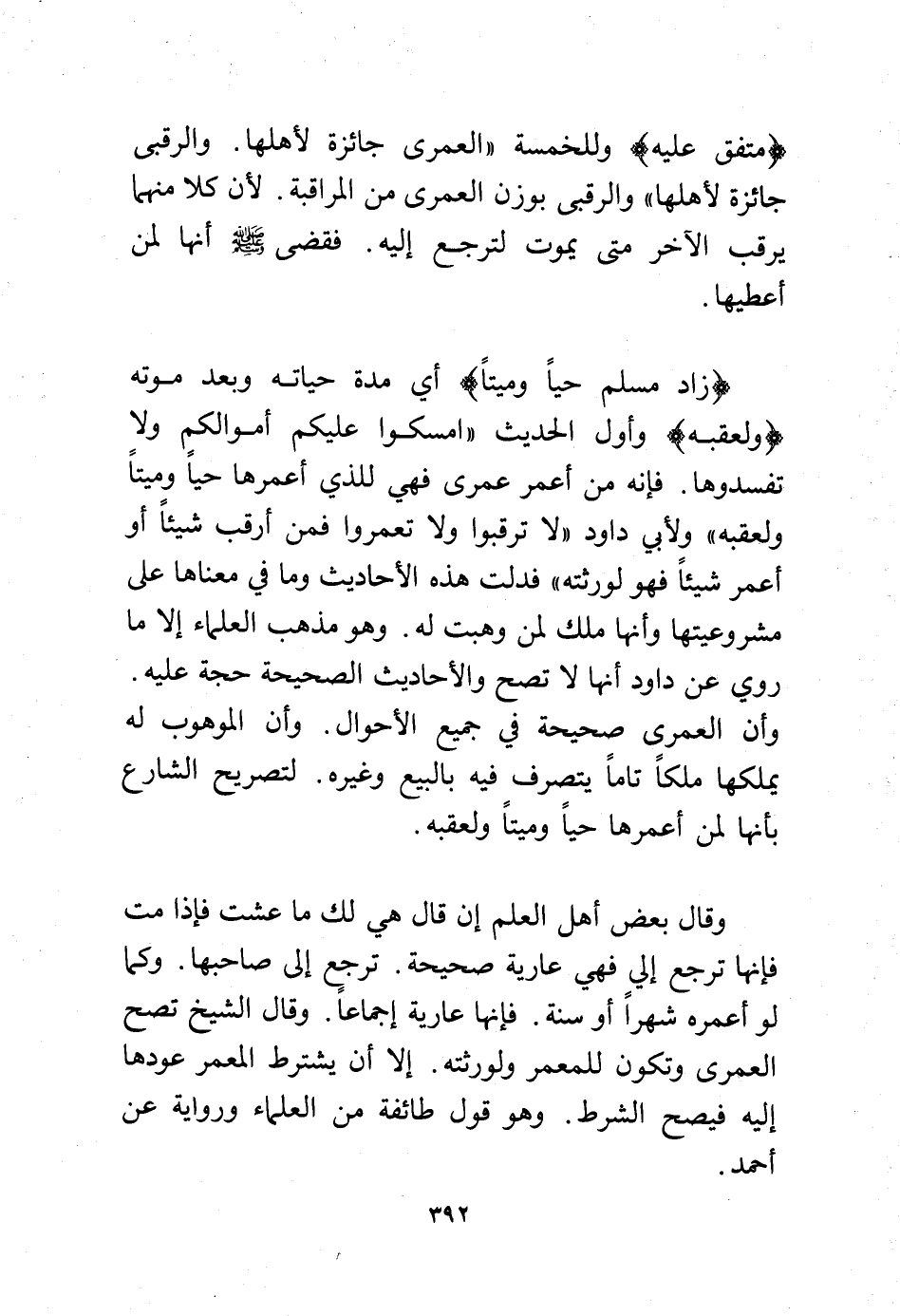 (زاد مسلم حيًا وميتًا) أي مدة حياته وبعد موته (ولعقبه) وأول الحديث "امسكوا عليكم أموالكم ولا تفسدوها. فإنه من أعمر عمرى فهي للذي أعمرها حيًا وميتًا ولعقبه" ولأبي داود "لا ترقبوا ولا تعمروا فمن أرقب شيئًا أو أعمر شيئًا فهو لورثته" فدلت هذه الأحاديث وما في معناها على مشروعيتها وأنها ملك لمن وهبت له. وهو مذهب العلماء إلا ما روي عن داود أنها لا تصح والأحاديث الصحيحة حجة عليه. وأن العمرى صحيحة في جميع الأحوال وأن الموهوب له يملكها ملكًا تامًا يتصرف فيه بالبيع وغيره. لتصريح الشارع بأنها لمن أعمرها حيًا وميتًا ولعقبه.
