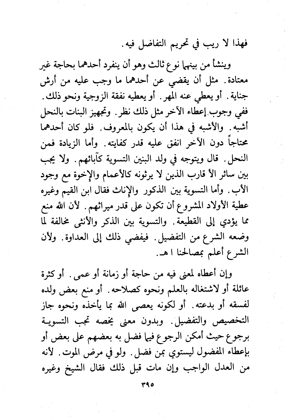 وينشأ من بينهما نوع ثالث وهو أن ينفرد أحدهما بحاجة غير معتادة. مثل أن يقضي عن أحدهما ما وجب عليه من أرش جناية. أو يعطي عنه المهر. أو يعطيه نفقة الزوجية ونحو ذلك. ففي وجوب إعطاء الآخر مثل ذلك نظر. وتجهيز البنات بالنحل أشبه. والأشبه في هذا أن يكون بالمعروف. فلو كان أحدهما محتاجًا دون الآخر انفق عليه قدر كفايته. وأما الزيادة فمن النحل. قال ويتوجه في ولد البنين التسوية كآبائهم. ولا يجب بين سائر الأقارب الذين لا يرثونه كالأعمام والإخوة مع وجود الأب. وأما التسوية بين الذكور والإناث فقال ابن القيم وغيره عطية الأولاد المشروع أن تكون على قدر ميراثهم. لأن الله منع مما يؤدي إلى القطيعة والتسوية بين الذكر والأنثى مخالفة لما وضعه الشرع من التفضيل. فيفضي ذلك إلى العداوة ولأن الشرع أعلم بمصالحنا اهـ.