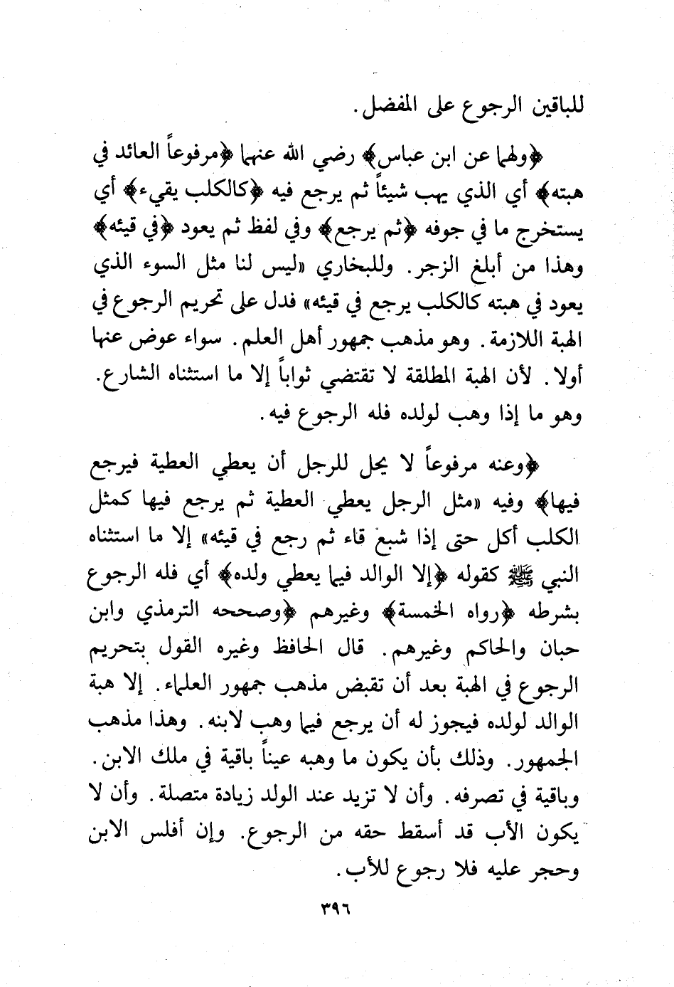 (وعنه مرفوعًا لا يحل للرجل أن يعطي العطية فيرجع فيها) وفيه "مثل الرجل يعطي العطية ثم يرجع فيها كمثل الكلب أكل حتى إذا شبع قاء ثم رجع في قيئه" إلا ما استثناه النبي - صلى الله عليه وسلم - كقوله (إلا الوالد فيما يعطي ولده) أي فله الرجوع بشرطه (رواه الخمسة) وغيرهم (وصححه الترمذي وابن حبان والحاكم وغيرهم. قال الحافظ وغيره القول بتحريم الرجوع في الهبة بعد أن تقبض مذهب جمهور العلماء. إلا هبة الوالد لولده فيجوز له أن يرجع فيما وهب لابنه. وهذا مذهب الجمهور. وذلك بأن يكون ما وهبه عينًا باقية في ملك الابن. وباقية في تصرفه. وأن لا تزيد عند الولد زيادة متصلة. وأن لا يكون الأب قد أسقط حقه من الرجوع. وإن أفلس الابن وحجر عليه فلا رجوع للأب.