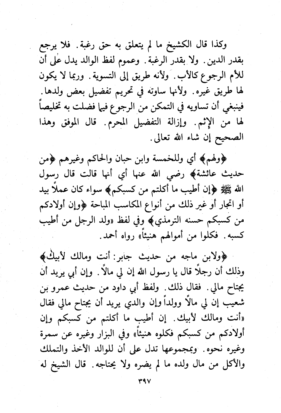 (ولهم) أي وللخمسة وابن حبان والحاكم وغيرهم (من حديث عائشة) رضي الله عنها أي أنها قالت قال رسول الله - صلى الله عليه وسلم - (إن أطيب ما أكلتم من كسبكم) سواء كان عملًا بيد أو اتجار أو غير ذلك من أنواع المكاسب المباحة (وإن أولادكم من كسبكم حسنه الترمذي) وفي لفظ "ولد الرجل من أطيب كسبه. فكلوا من أموالهم هنيئًا " رواه أحمد.