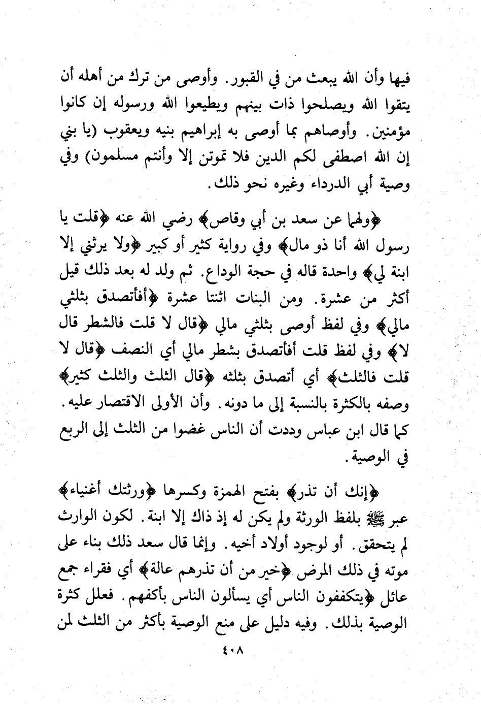 (ولهما عن سعد بن أبي وقاص) -رضي الله عنه- (قلت يا رسول الله أنا ذو مال) وفي رواية كثير أو كبير (ولا يرثني إلا ابنة لي) واحدة قاله في حجة الوداع. ثم ولد له بعد ذلك قيل أكثر من عشرة. ومن البنات اثنتا عشرة (أفأتصدق بثلثي مالي؟) وفي لفظ أوصي بثلثي مالي (قال لا قولت فالشطر قال لا) وفي لفظ قلت أفأتصدق بشطر مالي أي النصف (قال لا قلت فالثلث) أي أتصدق بثلثه (قال الثلث والثلث كثير) وصفه بالكثرة بالنسبة إلى ما دونه وأن الأولى الاقتصار عليه. كما قال ابن عباس وددت أن الناس غضوا من الثلث إلى الربع في الوصية.