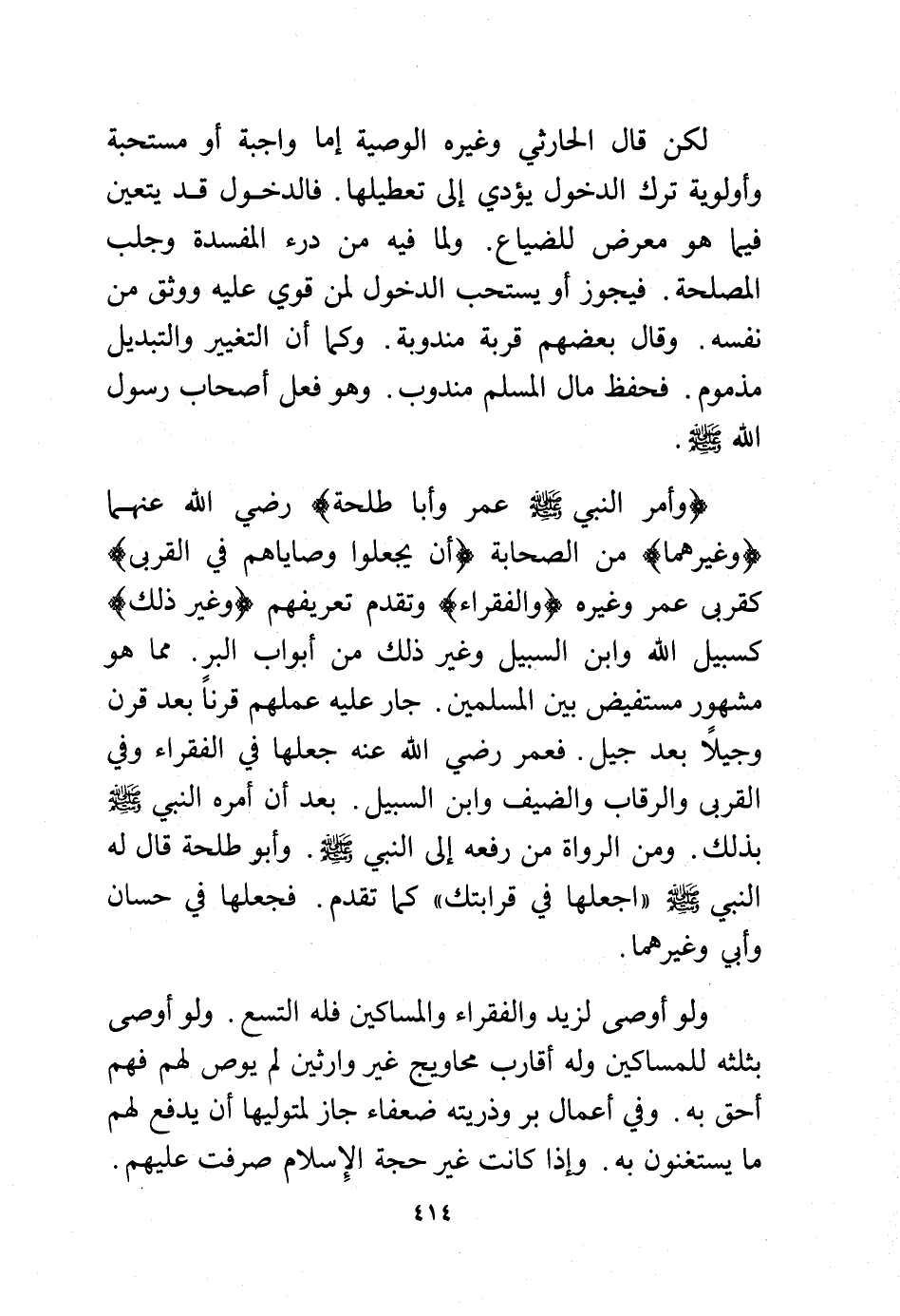 (وأمر النبي - صلى الله عليه وسلم - عمر وأبا طلحة) -رضي الله عنهما- (وغيرهما) من الصحابة (أن يجعلوا وصاياهم في القربى) كقربى عمر وغيره (وللفقراء) وتقدم تعريفهم (وغير ذلك) كسبيل الله وابن السبيل وغير ذلك من أبواب البر. مما هو مشهور مستفيض بين المسلمين. جار عليه عملهم قرناً بعد قرن وجيلاً بعد جيل. فعمر -رضي الله عنه- جعلها في الفقراء وفي القربى والرقاب والضيف وابن السبيل. بعد أن أمره النبي - صلى الله عليه وسلم - بذلك. ومن الرواه من رفعه إلى النبي - صلى الله عليه وسلم -. وأبو طلحة قال له النبي - صلى الله عليه وسلم - " اجعلها في قرابتك" كما تقدم. فجعلها في حسَّان وأبي وغيرهما.