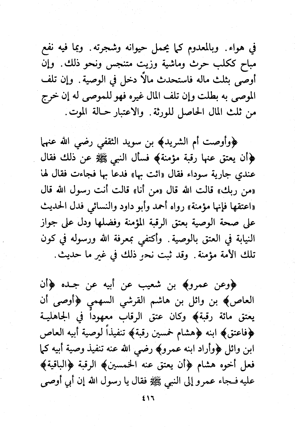(وأوصت أم الشريد) ابن سويد الثقفي -رضي الله عنهما- (أن يعتق عنها رقبة مؤمنة) فسأل النبي - صلى الله عليه وسلم - عن ذلك فقال عندي جارية سوداء فقال "ائت بها" فدعا بها فجاءت فقال لها "من ربك" قالت الله قال "من أنا" قالت أنت رسول الله قال "اعتقها فإنها مؤمنة" رواه أحمد وأبو داود والنسائي فدل الحديث على صحة الوصية بعتق الرقبة المؤمنة وفضلها ودل على جواز النيابة في العتق بالوصية. واكتفى بمعرفة الله ورسوله في كون تلك الأمة مؤمنة. وقد ثبت نحو ذلك في غير ما حديث.