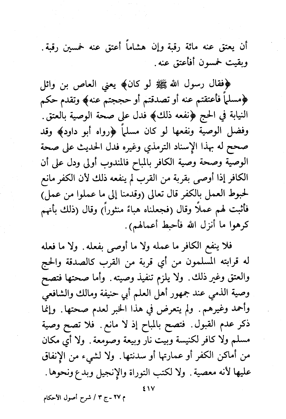 (فقال رسول الله - صلى الله عليه وسلم - لو كان) يعني العاص بن وائل (مسلماً فأعتقتم عنه أو تصدقتم أو حججتم عنه) وتقدم حكم النيابة في الحج (نفعه ذلك) فدل على صحة الوصية بالعتق. وفضل الوصية ونفعها لو كان مسلماً (رواه أبو داود) وقد صحح له بهذا الإسناد الترمذي وغيره فدل الحديث على صحة الوصية وصحة وصية الكافر بالمباح فالمندوب أولى ودل على أن الكافر إذا أوصى بقربة من القرب لم ينفعه ذلك لأن الكفر مانع لحبوط العمل بالكفر قال تعالى {وَقَدِمْنَا إِلَى مَا عَمِلُوا مِنْ عَمَلٍ} فأثبت لهم عملاً وقال {فَجَعَلْنَاهُ هَبَاء مَّنثُورًا َ} وقال {ذَلِكَ بِأَنَّهُمْ كَرِهُوا مَا أَنزَلَ اللَّهُ فَأَحْبَطَ أَعْمَالَهُم}.