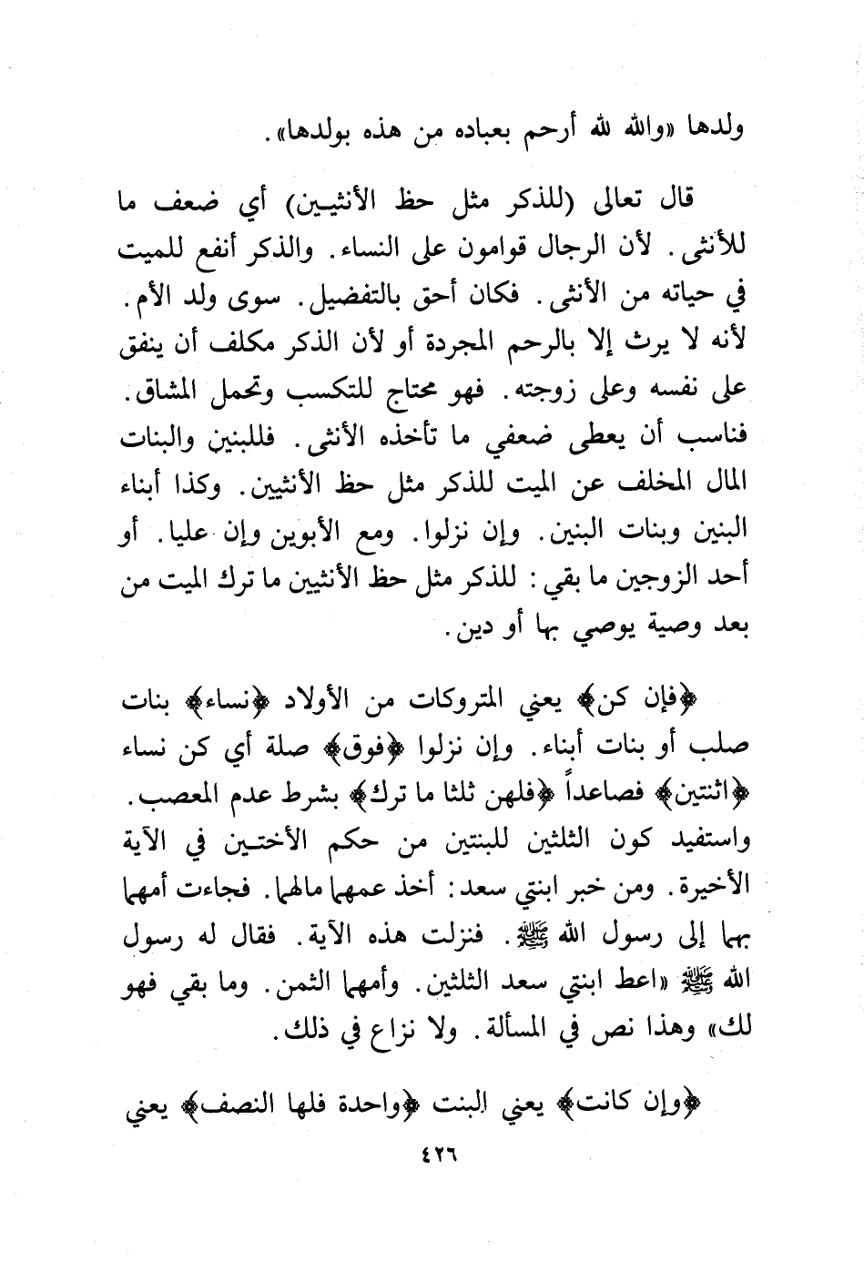 قال تعالى: {لِلذَّكَرِ مِثْلُ حَظِّ الأُنثَيَيْنِ} أي ضعف ما للأنثى. لأن الرجال قوامون على النساء. والذكر أنفع للميت في حياته من الأنثى. فكان أحق بالتفضيل. سوى ولد الأم. لأنه لا يرث إلا بالرحم المجردة أو لأن الذكر مكلف أن ينفق على نفسه وعلى زوجته. فهو محتاج للتكسب وتحمل المشاق.