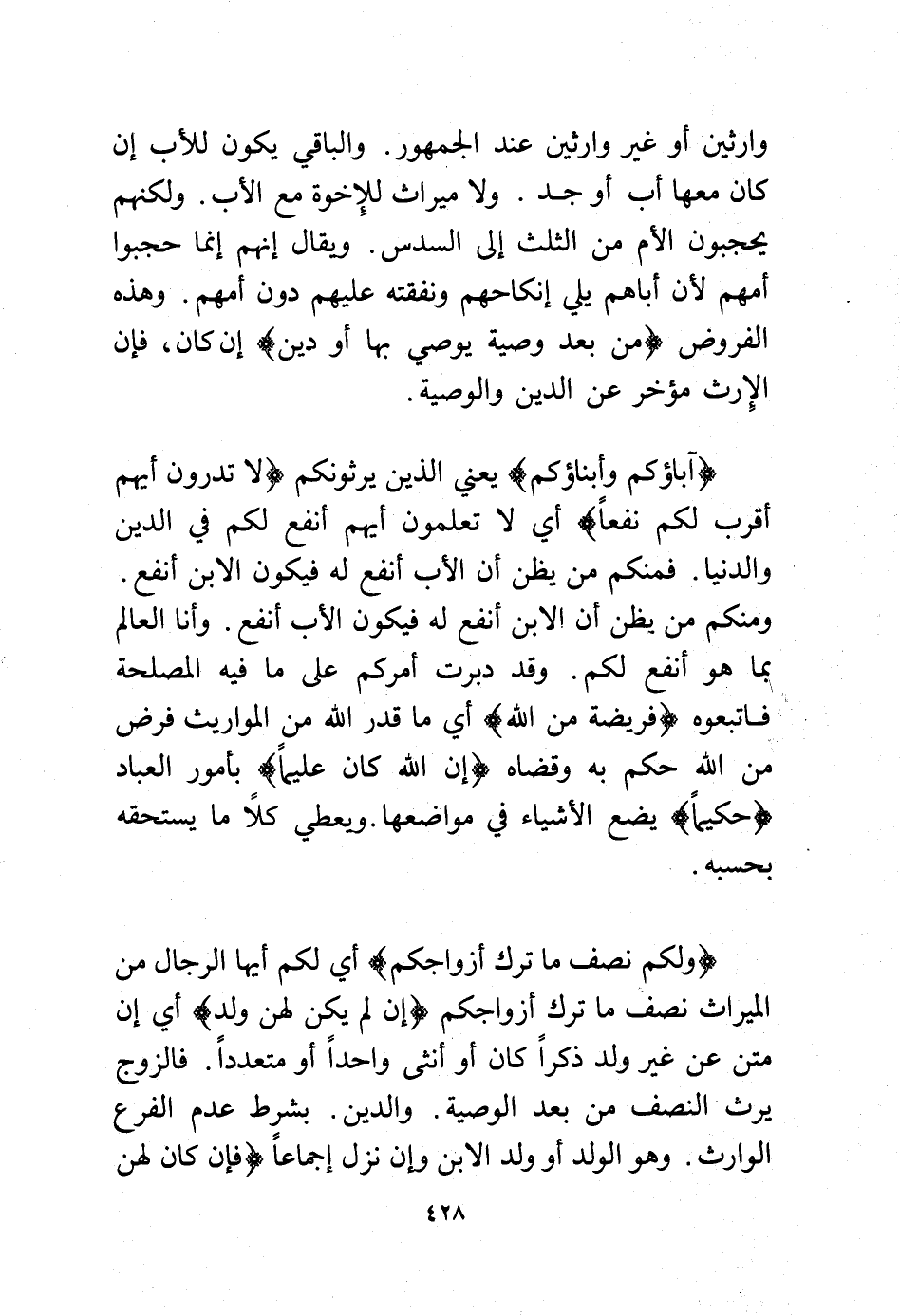 وارثين أو غير وارثين عند الجمهور. والباقي يكون للأب إن كان معها أب أو جد. ولا ميراث للإخوة مع الأب. ولكنهم يحجبون الأم من الثلث إلى السدس. ويقال إنهم إنما حجبوا أمهم لأن أباهم يلي إنكاحهم ونفقته عليهم دون أمهم. وهذه الفروض {مِن بَعْدِ وَصِيَّةٍ يُوصِي بِهَا أَوْ دَيْنٍ} إن كان، فإن الإرث مؤخر عن الدين والوصية.