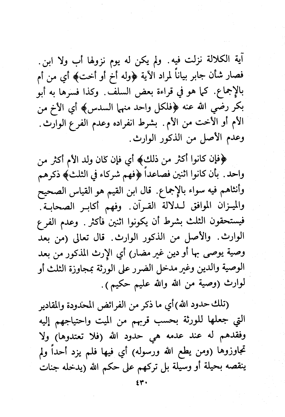 آية الكلالة نزلت فيه. ولم يكن له يوم نزولها أب ولا ابن. فصار شأن جابر بيانًا لمراد الآية {وَلَهُ أَخٌ أَوْ أُخْتٌ} أي من أم بالإجماع. كما هو في قراءة بعض السلف. وكذا فسرها به أبو بكر -رضي الله عنه- {فَلِكُلِّ وَاحِدٍ مِّنْهُمَا السُّدُسُ} أي الأخ من الأم أو الأخت من الأم. بشرط انفراده وعدم الفرع الوارث. وعدم الأصل من الذكور الوارث.