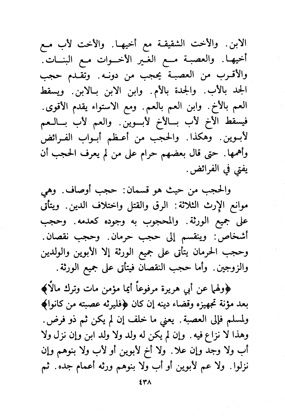 والأقرب من العصبة يحجب من دونه. وتقدم حجب الجد بالأب. والجدة بالأم. وابن الابن بالابن. ويسقط العم بالأخ. وابن العم بالعم. ومع الاستواء يقدم الأقوى. فيسقط الأخ لأب بالأخ لأبوين. والعم لأب بالعم لأبوين وهكذا. والحجب من أعظم أبواب الفرائض وأهمها. حتى قال بعضهم حرام على من لم يعرف الحجب أن يفتي في الفرائض.