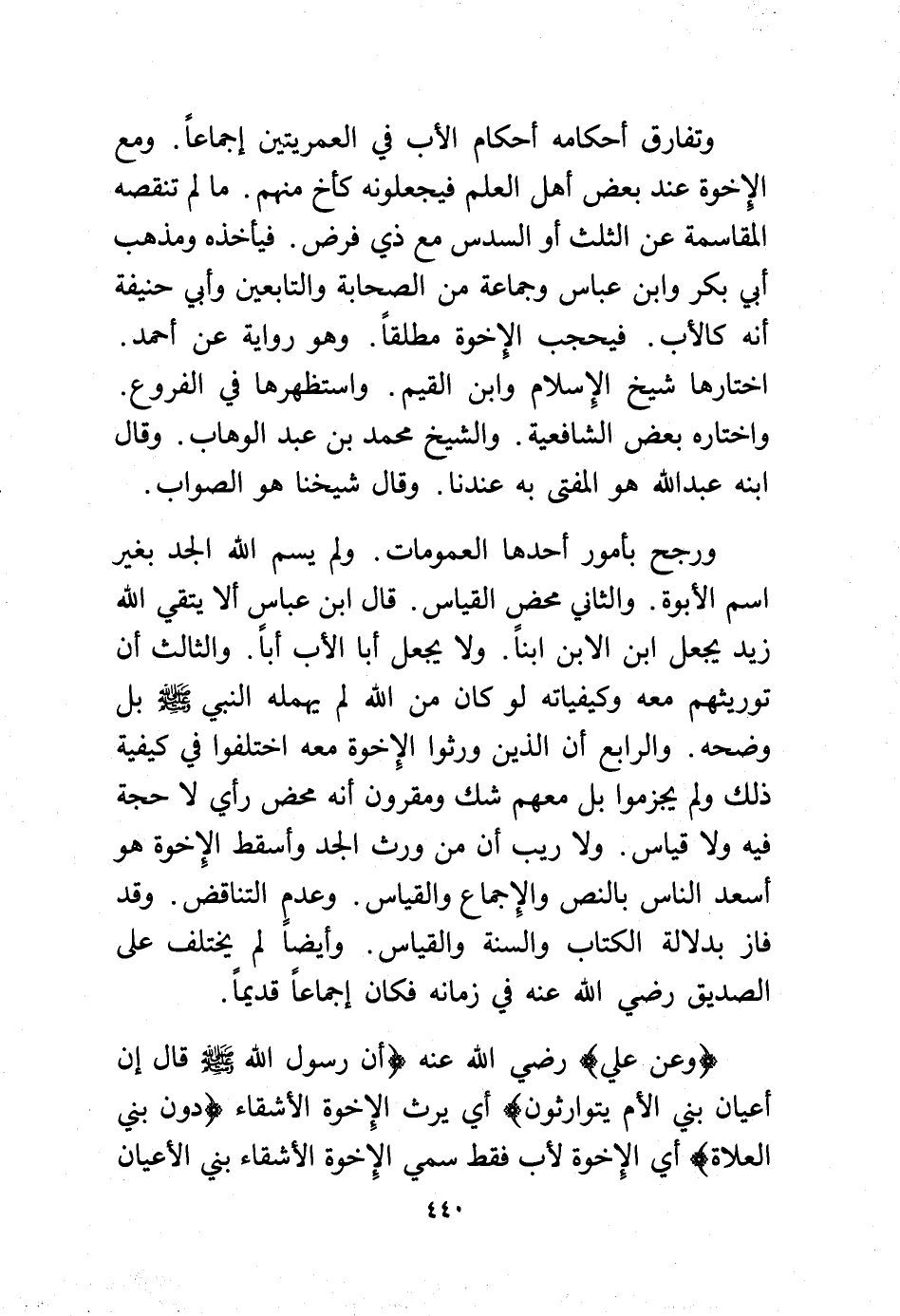 (وعن علي) -رضي الله عنه- (أن رسول الله - صلى الله عليه وسلم - قال إن أعيان بني الأم يتوارثون) أي يرث الإخوة الأشقاء (دون بني العلاة) أي الإخوة لأب فقط سمي الإخوة الأشقاء بني الأعيان