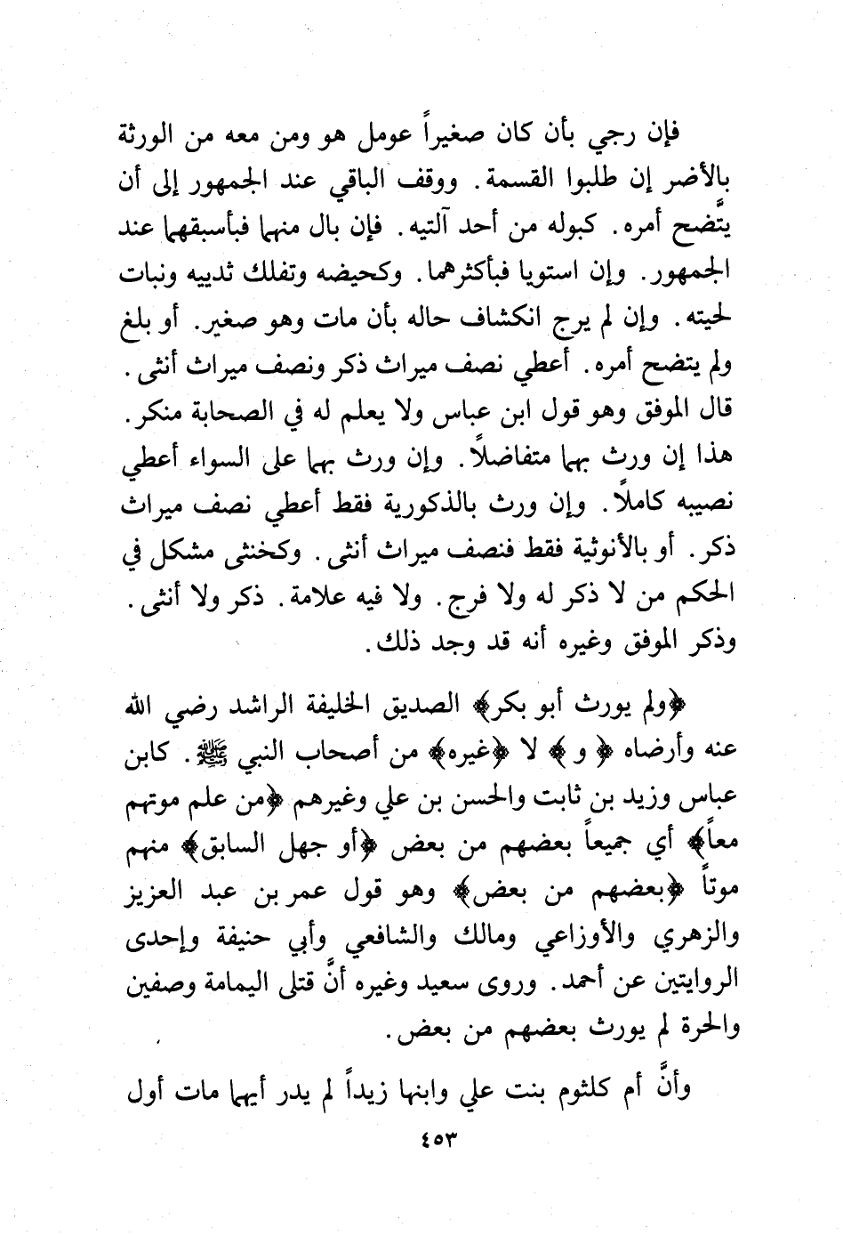 (ولم يورث أبو بكر) الصديق الخليفة الراشد -رضي الله عنه- وأرضاه (و) لا (غيره) من أصحاب النبي - صلى الله عليه وسلم - كابن عباس وزيد بن ثابت والحسن بن علي وغيرهم (من علم موتهم معًا) أي جميعًا بعضهم من بعض (أو جهل السابق) منهم موتًا (بعضهم من بعض) وهو قول عمر بن عبد العزيز والزهري والأوزاعي ومالك والشافعي وأبي حنيفة وإحدى الروايتين عن أحمد. وروى سعيد وغيره أن قتلى اليمامة وصفين والحرة لم يورث بعضهم من بعض.