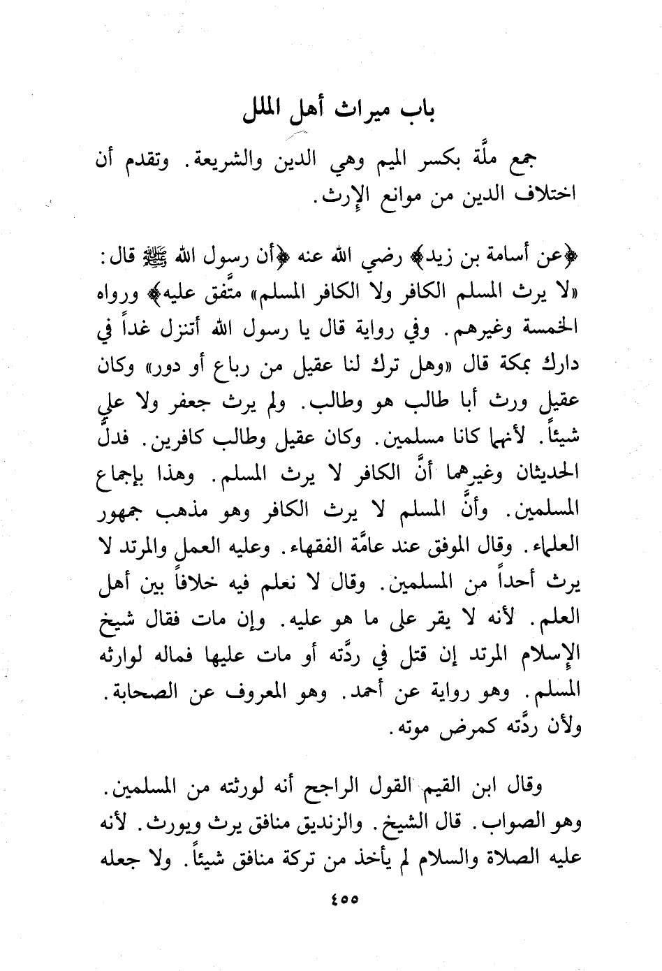(وعن أسامة بن زيد) -رضي الله عنه- (أن رسول الله - صلى الله عليه وسلم - قال: "لا يرث المسلم الكافر ولا الكافر المسلم" متفق عليه) ورواه الخمسة وغيرهم. وفي رواية قال يا رسول الله أتنزل غدًا في دارك بمكة قال "وهل ترك لنا عقيل من رباع أو دور" وكان عقيل ورث أبا طالب هو وطالب. ولم يرث جعفر ولا علي شيئًا. لأنهما كانا مسلمين. وكان عقيل وطالب كافرين. فدل الحديثان وغيرهما أن الكافر لا يرث المسلم. وهذا بإجماع المسلمين. وأن المسلم لا يرث الكافر وهو مذهب جمهور العلماء. وقال الموفق عند عامة الفقهاء. وعليه العمل والمرتد لا يرث أحدًا من المسلمين. وقال لا نعلم فيه خلافًا بين أهل العلم. لأنه لا يقر على ما هو عليه. وإن مات فقال شيخ الإسلام المرتد إن قتل في ردته أو مات عليها فماله لوارثه المسلم. وهو رواية عن أحمد وهو المعروف عن الصحابة. ولأن ردته كمرض موته.