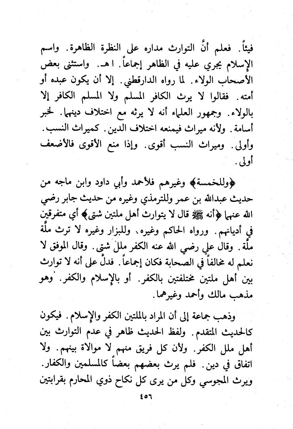 (وللخمسة) وغيرهم فلأحمد وأبي داود وابن ماجه من حديث عبد الله بن عمر وللترمذي وغيره من حديث جابر -رضي الله عنهما- (أنه - صلى الله عليه وسلم - قال لا يتوارث أهل ملتين شتى) أي متفرقين في أديانهم. ورواه الحاكم وغيره وللبزار وغيره لا ترث ملة ملة. وقال علي -رضي الله عنه- الكفر ملل شتى. وقال الموفق لا نعلم له مخالفًا في الصحابة فكان إجماعًا فدل على أنه لا توارث بين أهل ملتين مختلفتين بالكفر. أو بالإسلام والكفر وهو مذهب مالك وأحمد وغيرهما.