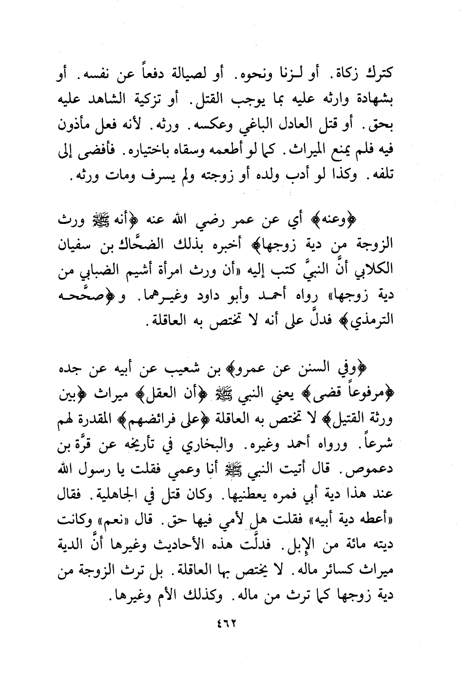 (وفي السنن عن عمرو) بن شعيب عن أبيه عن جده (مرفوعًا قضى) يعني النبي - صلى الله عليه وسلم - (أن العقل) ميراث (بين ورثة القتيل) لا تختص به العاقلة (على فرائضهم) المقدرة لهم شرعًا. ورواه أحمد وغيره. والبخاري في تأريخه عن قرة بن دعموص قال أتيت النبي - صلى الله عليه وسلم - أنا وعمي فقلت يا رسول الله عند هذا دية أبي فمره يعطنيها. وكان قتل في الجاهلية فقال أعطه دية أبيه" فقلت هل لأمي فيها حق قال "نعم" وكانت ديته مائة من الإبل. فدلت هذه الأحاديث وغيرها أن الدية ميراث كسائر ماله لا يختص بها العاقلة بل ترث الزوجة من دية زوجها كما ترث من ماله وكذلك الأم وغيرها.