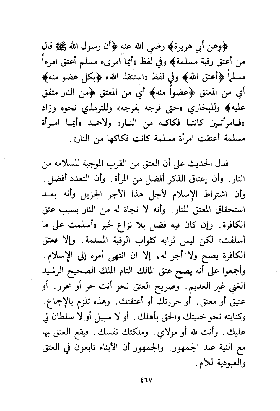 (وعن أبي هريرة) -رضي الله عنه- (أن رسول الله - صلى الله عليه وسلم - قال من أعتق رقبة مسلمة) وفي لفظ "ايما امرئ مسلم أعتق امرءًا مسلمًا (أعتق الله) وفي لفظ "استنقذ الله" (بكل عضو منه) أي من المعتق (عضوًا منه) أي من المعتق (من النار متفق عليه) وللبخاري "حتى فرجه بفرجه" وللترمذي نحوه وزاد فامرأتين كانتا فكاكه من النار" ولأحمد "أيما امرأة مسلمة أعتقت امرأة مسلمة كانت فكاكها من النار".