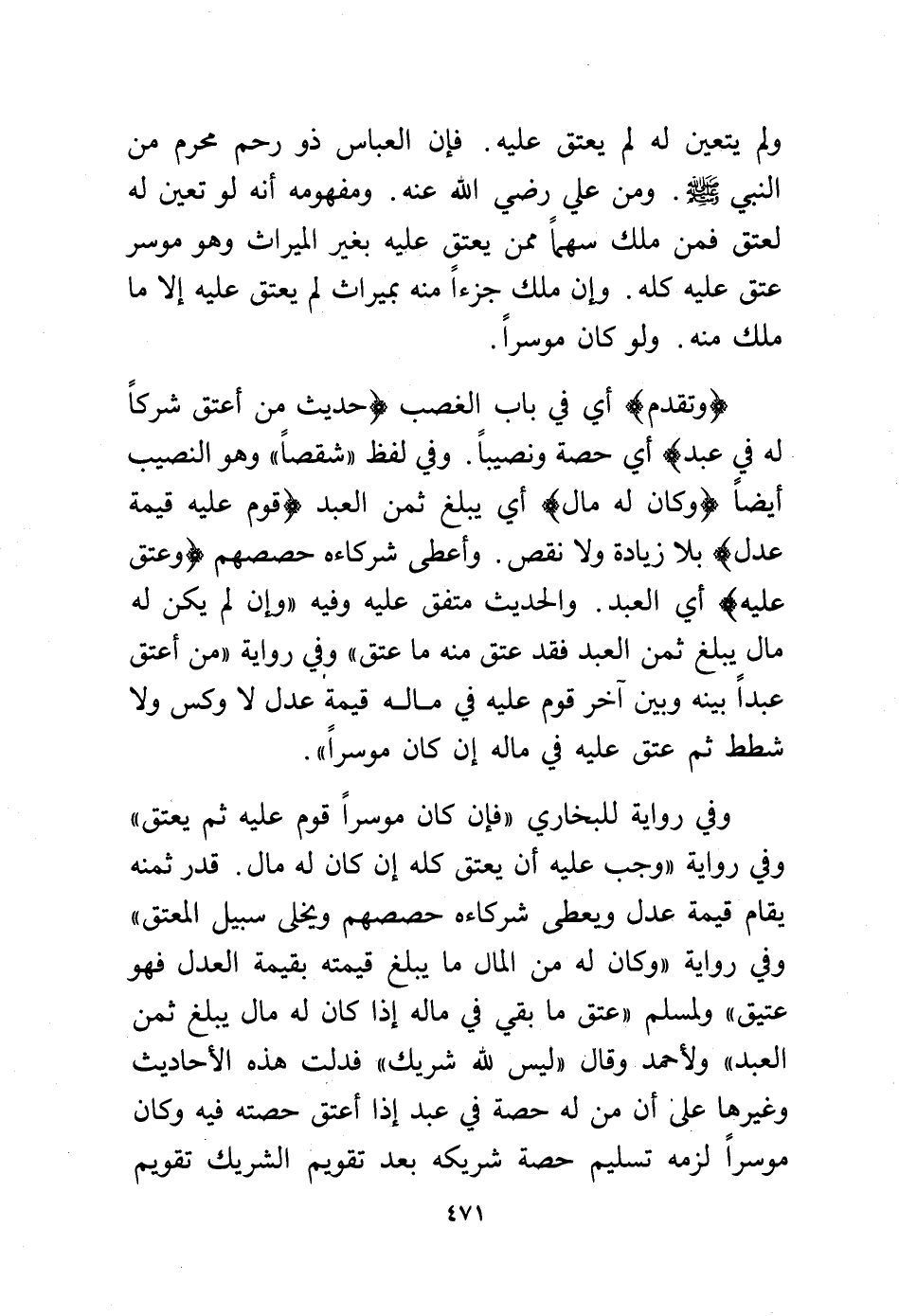 وفي رواية للبخاري "فإن كان موسرًا قوم عليه ثم يعتق" وفي رواية "وجب عليه أن يعتق كله إن كان له مال. قدر ثمنه يقام قيمة عدل ويعطى شركاءه حصصهم ويخلى سبيل المعتق" وفي رواية "وكان له من المال ما يبلغ قيمته بقيمة العدل فهو عتيق" ولمسلم "عتق ما بقي في ماله إذا كان له مال يبلغ ثمن العبد" ولأحمد وقال "ليس لله شريك" فدلت هذه الأحاديث وغيرها على أن من له حصة في عبد إذا أعتق حصته فيه وكان موسرًا لزمه تسليم حصة شريكه بعد تقويم الشريك تقويم