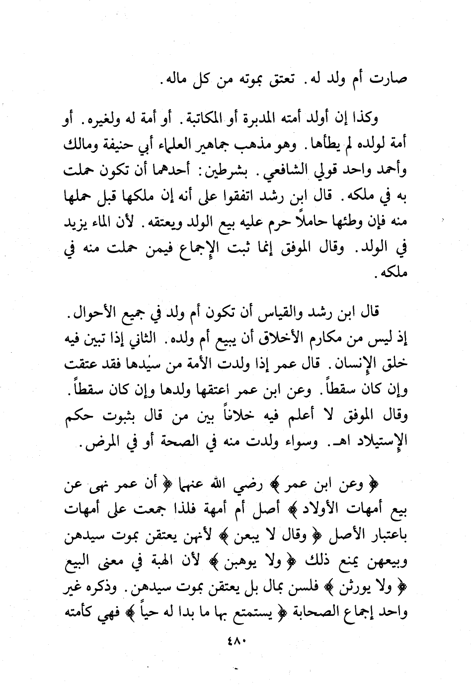 (وعن ابن عمر) -رضي الله عنهما- (أن عمر نهى عن بيع أمهات الأولاد) أصل أم أمهة فلذا جمعت على أمهات باعتبار الأصل (وقال لا يبعن) لأنهن يعتقن بموت سيدهن وبيعهن