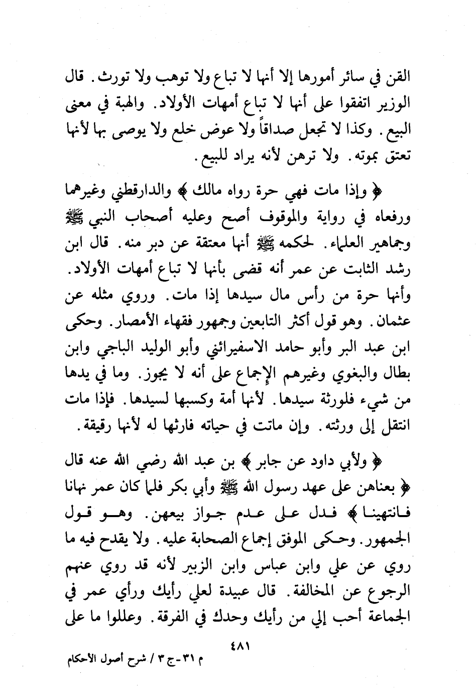 وأنها حرة من رأس مال سيدها إذا مات. وروي مثله عن عثمان. وهو قول أكثر التابعين وجمهور فقهاء الأمصار. وحكى ابن عبد البر وأبو حامد الاسفيرائني وأبو الوليد الباجي وابن بطال والبغوي وغيرهم الأجماع على أنه لا يجوز وما في يدها من شيء فلورثة سيدها لأنها أمة وكسبها لسيدها فإذا مات انتقل إلى ورثته وإن ماتت في حياته فارثها له لأنها رقيقة.