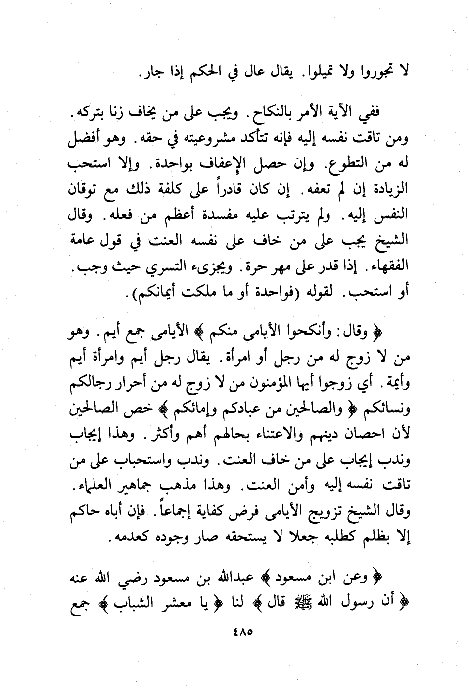 (وقال: {وَأَنكِحُوا الأَيَامَى مِنكُمْ} الأيامى جمع أيم. وهو من لا زوج له من رجل أو امرأة يقال رجل أيم وامرأة أيم وأيمة أي زوجوا أيها المؤمنون من لا زوج له من أحرار رجالكم ونسائكم {وَالصَّالِحِينَ مِنْ عِبَادِكُمْ وَإِمَائِكُمْ} خص الصالحين لأن إحصان دينهم والاعتناء بحالهم أهم وأكثر. وهذا إيجاب وندب إيجاب على من خاف العنت. وندب واستحباب على من تاقت نفسه إليه وأمن العنت. وهذا مذهب جماهير العلماء. وقال الشيخ تزويج الأيامى فرض كفاية إجماعًا. فإن أباه حاكم إلا بظلم كطلبه جعلا لا يستحقه صار وجوده كعدمه.