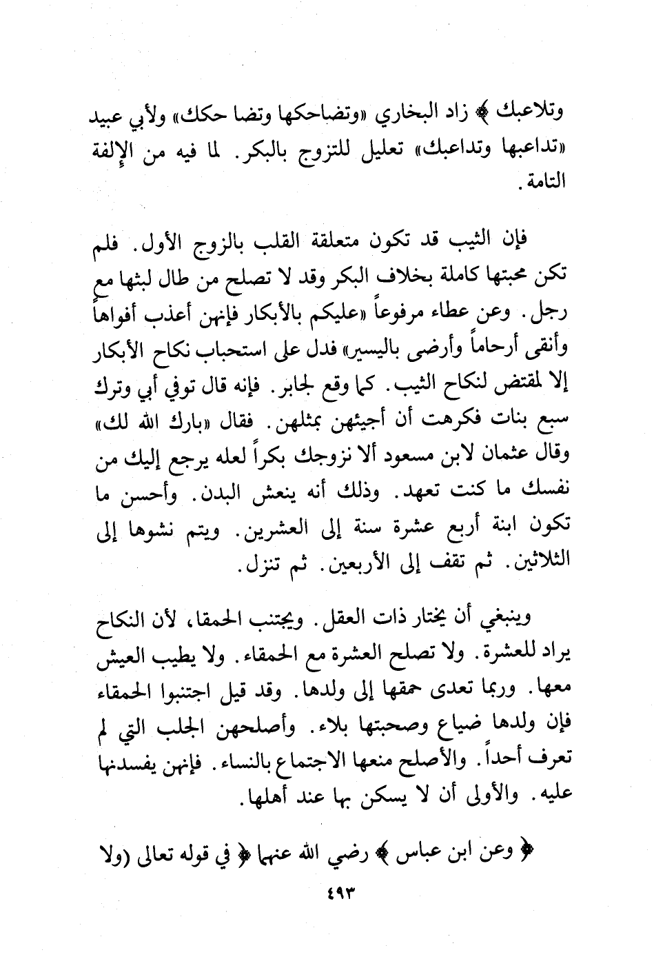 فإن الثيب قد تكون متعلقة القلب بالزوج الأول. فلم تكن محبتها كاملة بخلاف البكر وقد لا تصلح من طال لبثها مع رجل. وعن عطاء مرفوعًا "عليكم بالأبكار فإنهن أعذب أفواهًا وأنقى أرحامًا وأرضى باليسير" فدل على استحباب نكاح الأبكار إلا لمقتض لنكاح الثيب كما وقع لجابر فإنه قال توفي أبي وترك سبع بنات فكرهت أن أجيئهن بمثلهن. فقال "بارك الله لك" وقال عثمان لابن مسعود ألا نزوجك بكرًا لعله يرجع إليك من نفسك ما كنت تعهد وذلك أنه ينعش البدن وأحسن ما تكون ابنة أربع عشرة سنة إلى العشرين. ويتم نشوها إلى الثلاثين ثم تقف إلى الأربعين ثم تنزل.