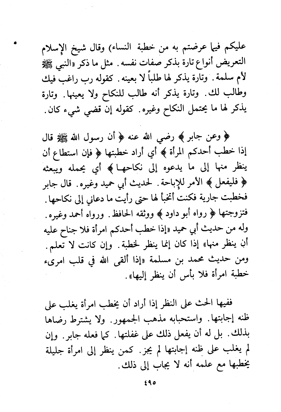 (وعن جابر) -رضي الله عنه- (أن رسول الله - صلى الله عليه وسلم - قال إذا خطب أحدكم المرأة) أي أراد خطبتها (فإن استطاع أن ينظر منها إلى ما يدعوه إلى نكاحها) أي يحمله ويبعثه (فليفعل) الأمر للإباحة لحديث أبي حميد وغيره. قال جابر فخطبت جارية فكنت أتخبأ لها حتى رأيت ما دعاني إلى نكاحها. فتزوجتها (رواه أبو داود) ووثقه الحافظ ورواه أحمد وغيره وله من حديث أبي حميد "إذا خطب أحدكم امرأة فلا جناح عليه أن ينظر منها" إذا كان إنما ينظر لخطبة. إن كانت لا تعلم من حديث محمد بن مسلمة "إذا ألقى الله في قلب امرئ خطبة امرأة فلا بأس أن ينظر إليها".