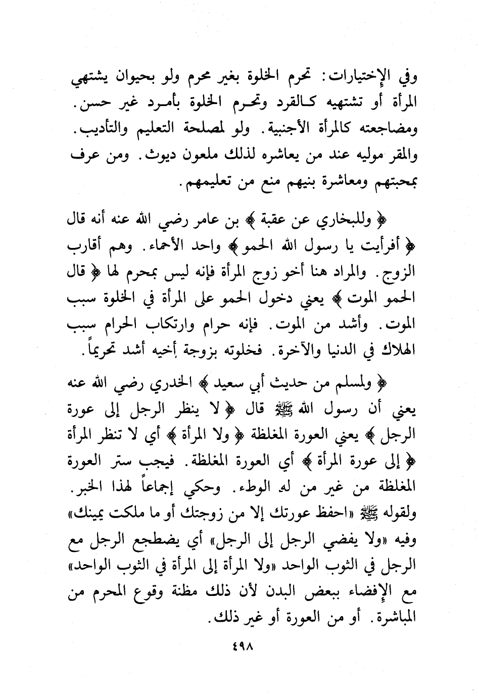 وفي الاختيارات: تحرم الخلوة بغير محرم ولو بحيوان يشتهي المرأة أو تشتهيه كالقرد وتحرم الخلوة بأمرد غير حسن.