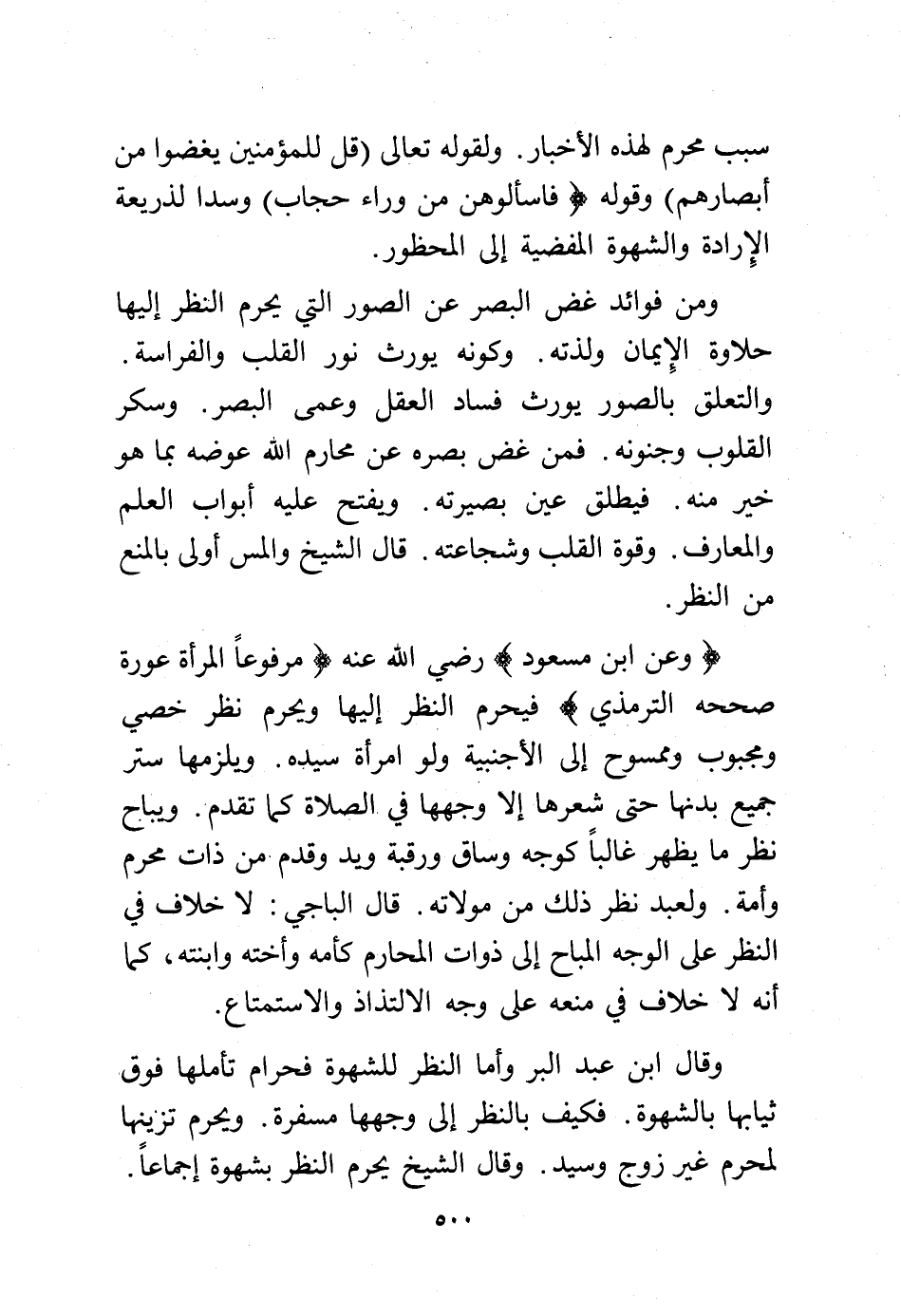 ومن فوائد غض البصر عن الصور التي يحرم النظر إليها حلاوة الإيمان ولذته. وكونه يورث نور القلب والفراسة. والتعلق بالصور يورث فساد العقل وعمى البصر. وسكر القلوب وجنونه فمن غض بصره عن محارم الله عوضه بما هو خير منه فيطلق عين بصيرته. ويفتح عليه أبواب العلم والمعارف وقوة القلب وشجاعته. قال الشيخ والمس أولى بالمنع من النظر.