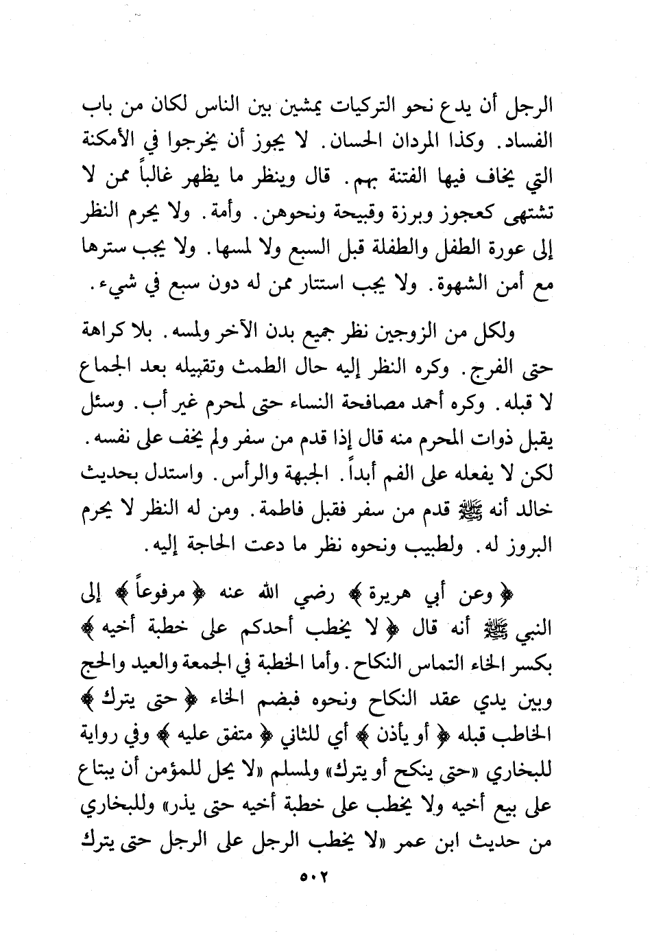 (وعن أبي هريرة) -رضي الله عنه- (مرفوعًا) إلى النبي - صلى الله عليه وسلم - أنه قال (لا يخطب أحدكم على خطبة أخيه) بكسر الخاء التماس النكاح. وأما الخطبة في الجمعة والعيد والحج وبين يدي عقد النكاح ونحوه فبضم الخاء (حتى يترك) الخاطب قبله (أو يأذن) أي للثاني (متفق عليه) وفي رواية للبخاري " حتى ينكح