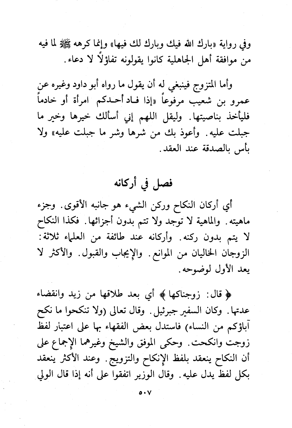 أي أركان النكاح وركن الشيء هو جانبه الأقوى. وجزء ماهيته. والماهية لا توجد ولا تتم بدون أجزائها فكذا النكاح لا يتم بدون ركنه. وأركانه عند طائفة من العلماء ثلاثة: الزوجان الخاليان من الموانع. والإيجاب والقبول. والأكثر لا يعد الأول لوضوحه.