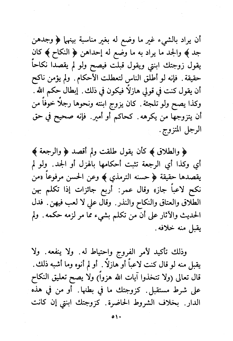 أن يراد بالشيء غير ما وضع له بغير مناسبة بينهما (وجدهن جد) والجد ما يراد به ما وضع له إحداهن (النكاح) كان يقول زوجتك ابنتي ويقول قبلت فيصح ولو لم يقصدا نكاحًا حقيقة. فإنه لو أطلق الناس لتعطلت الأحكام. ولم يؤمن ناكح أن يقول كنت في قولي هازلًا فيكون في ذلك إبطال حكم الله. وكذا يصح ولو تلجئة كان يزوج ابنته ونحوها رجلًا خوفًا من أن يتزوجها من يكرهه. كحاكم أو أمير. فإنه صحيح في حق الرجل المتزوج.