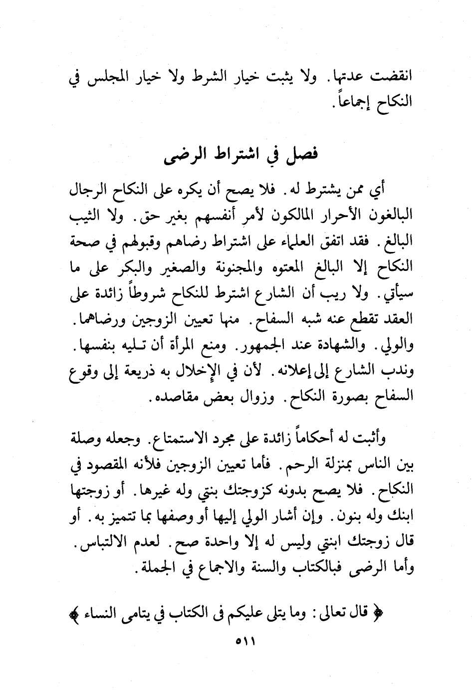 وأثبت له أحكامًا زائدة على مجرد الاستمتاع. وجعله وصلة بين الناس بمنزل الرحم. فأما تعيين الزوجين فلأنه المقصود في النكاح فلا يصح بدونه كزوجتك بنتي وله غيرها أو زوجتها ابنك وله بنون وإن أشار الولي إليها أو وصفها بما تتميز به أو قال زوجتك ابنتي وليس له إلا واحدة صح لعدم الالتباس. وأما الرضى فبالكتاب والسنة والإجماع في الجملة.