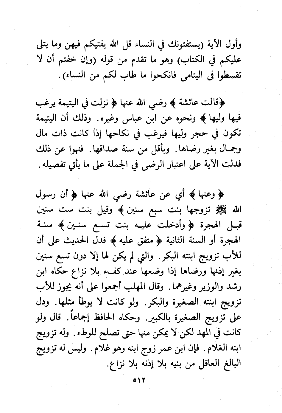 (وعنها) أي عن عائشة رضي الله عنها (أن رسول الله - صلى الله عليه وسلم - تزوجها بنت سبع سنين) وقيل بنت ست سنين قبل الهجرة (وأدخلت عليه بنت تسع سنين) سنة الهجرة أو السنة الثانية (متفق عليه) فدل الحديث على أن للأب تزويج ابنته البكر. والتي لم يكن لها إلا دون تسع سنين بغير إذنها ورضاها إذا وضعها عند كفء بلا نزاع حكاه ابن رشد والوزير وغيرهما وقال المهلب أجمعوا على أنه يجوز للأب تزويج ابنته الصغيرة والبكر. ولو كانت لا يوطأ مثلها. ودل على تزويج الصغيرة بالكبير. وحكاه الحافظ إجماعًا. قال ولو كانت في المهد لكن لا يمكن منها حتى تصلح للوطء. وله تزويج ابنه الغلام. فإن ابن عمر زوج ابنه وهو غلام. وليس له تزويج البالغ العاقل من بنيه بلا إذنه بلا نزاع.