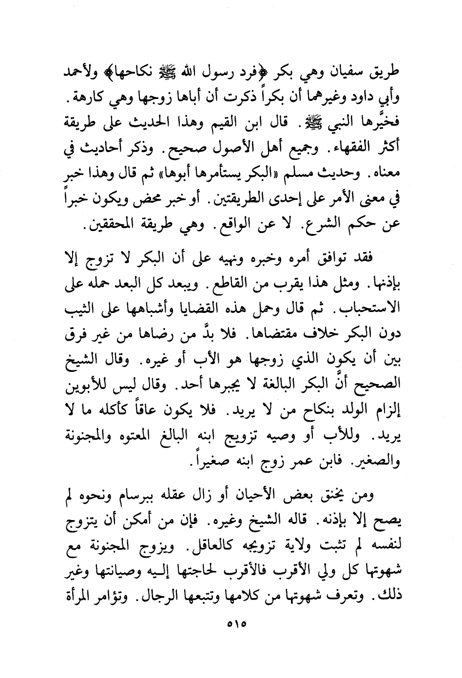 فقد توافق أمره وخبره ونهيه على أن البكر لا تزوج إلا بإذنها ومثل هذا يقرب من القاطع ويبعد كل البعد حمله على الاستحباب ثم قال وحمل هذه القضايا وأشباهها على الثيب دون البكر خلاف مقتضاها. فلا بد من رضاها من غير فرق بين أن يكون الذي زوجها هو الأب أو غيره. وقال الشيخ الصحيح أن البكر البالغة لا يجبرها أحد. وقال ليس للأبوين إلزام الولد بنكاح من لا يريد فلا يكون عاقًا كأكله ما لا يريد وللأب أو وصيه تزويج ابنه البالغ المعتوه والمجنونة والصغير فابن عمر زوج ابنه صغيرًا.