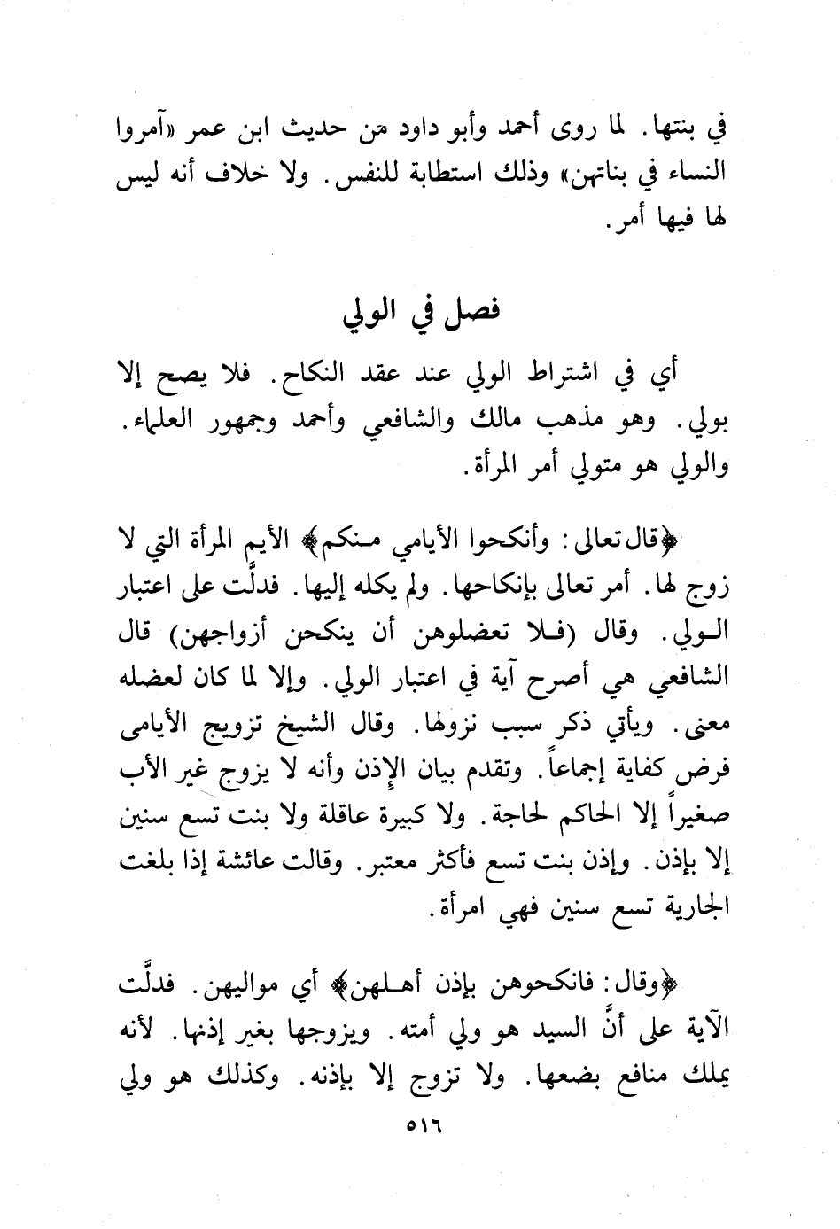 (قال تعالى: {وَأَنكِحُوا الأَيَامَى مِنكُمْ} الأيم المرأة التي لا زوج لها. أمر تعالى بإنكاحها ولم يكله إليها فدلت على اعتبار الولي. وقال {فَلاَ تَعْضُلُوهُنَّ أَن يَنكِحْنَ أَزْوَاجَهُنَّ} قال الشافعي هي أصرح آية في اعتبار الولي. وإلا لما كان لعضله معنى ويأتي ذكر سبب نزولها. وقال الشيخ تزويج الأيامى فرض كفاية إجماعًا. وتقدم بيان الإذن وأنه لا يزوج غير الأب صغيرًا إلا الحاكم لحاجة. ولا كبيرة عاقلة ولا بنت تسع سنين إلا بإذن. وإذن بنت تسع فأكثر معتبر وقالت عائشة إذا بلغت الجارية تسع سنين فهي امرأة.