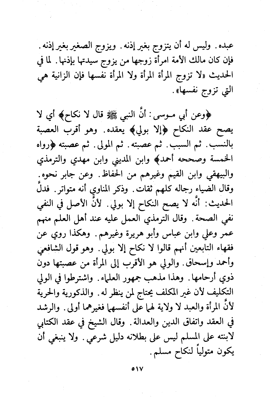 (وعن أبي موسى: أن النبي - صلى الله عليه وسلم - قال لا نكاح) أي لا يصح عقد النكاح (إلا بولي) يعقده. وهو أقرب العصبة بالنسب ثم السبب ثم عصبته ثم المولى. ثم عصبته (رواه الخمسة وصححه أحمد) وابن المديني وابن مهدي والترمذي والبيهقي وابن القيم وغيرهم من الحفاظ. وعن جابر نحوه وقال الضياء رجاله كلهم ثقات. وذكر المناوي أنه متواتر فدل الحديث: أنه لا يصح النكاح إلا بولي. لأن الأصل في النفي نفي الصحة وقال الترمذي العمل عليه عند أهل العلم منهم عمر وعلي وابن عباس وأبو هريرة وغيرهم. وهكذا روي عن فقهاء التابعين أنهم قالوا لا نكاح إلا بولي. وهو قول الشافعي وأحمد وإسحاق. والولي هو الأقرب إلا المرأة من عصبتها دون ذوي أرحامها وهذا مذهب جمهور العلماء. واشترطوا في الولي التكليف لأن غير المكلف يحتاج لمن ينظر له. والذكورية والحرية لأن المرأة والعبد لا ولاية لهما على أنفسهما فغيرهما أولى والرشد في العقد واتفاق الدين والعدالة وقال الشيخ في عقد الكتابي لابنته على المسلم ليس على بطلانه دليل شرعي ولا ينبغي أن يكون متوليًا لنكاح مسلم.