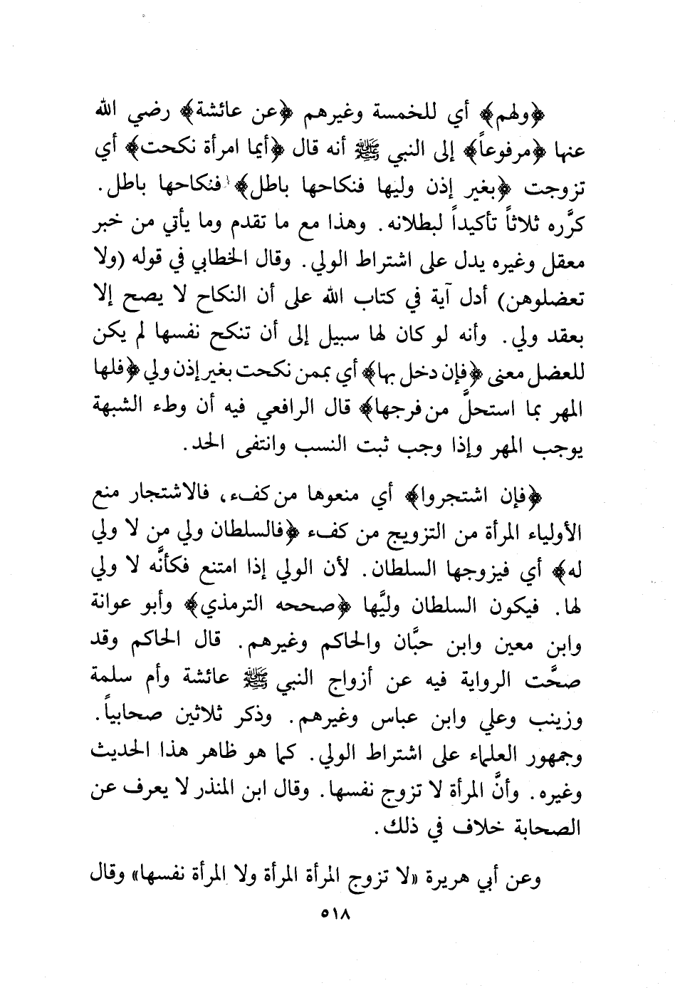 وجمهور العلماء على اشتراط الولي. كما هو ظاهر هذا الحديث وغيره. وأن المرأة لا تزوج نفسها. وقال ابن المنذر لا يعرف عن الصحابة خلاف في ذلك.